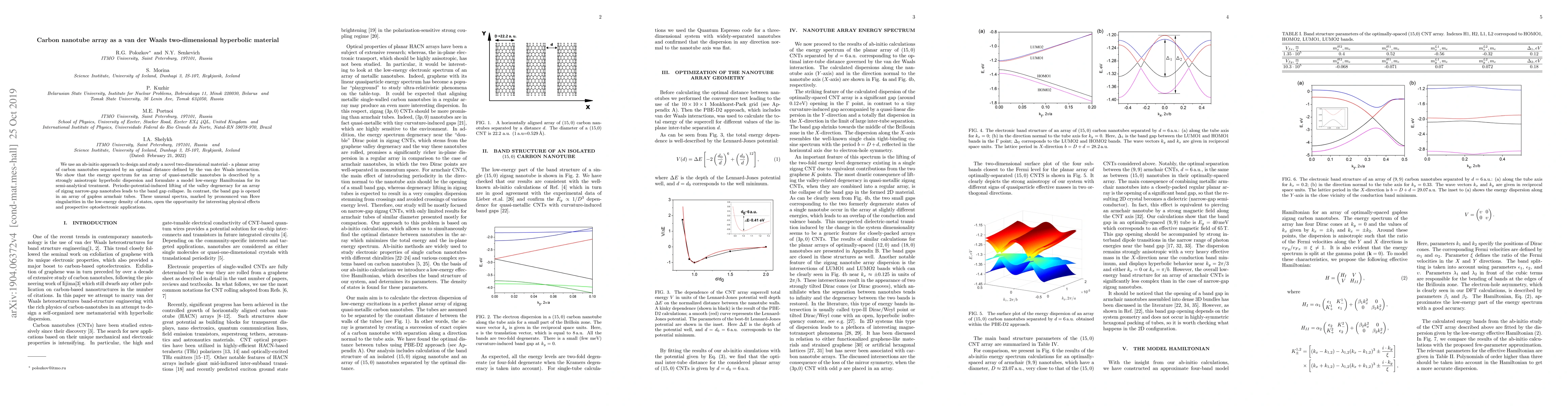 We use an ab-initio approach to design and study a novel two-dimensional material - a planar array of carbon nanotubes separated by an optimal distance defined by the van der Waals interaction. We show that the energy spectrum for an array of quasi-metallic nanotubes is described by a strongly anisotropic hyperbolic dispersion and formulate a model low-energy Hamiltonian for its semi-analytical treatment. Periodic-potential-induced lifting of the valley degeneracy for an array of zigzag narrow-gap nanotubes leads to the band gap collapse. In contrast, the band gap is opened in an array of gapless armchair tubes. These unusual spectra, marked by pronounced van Hove singularities in the low-energy density of states, open the opportunity for interesting physical effects and prospective optoelectronic applications.