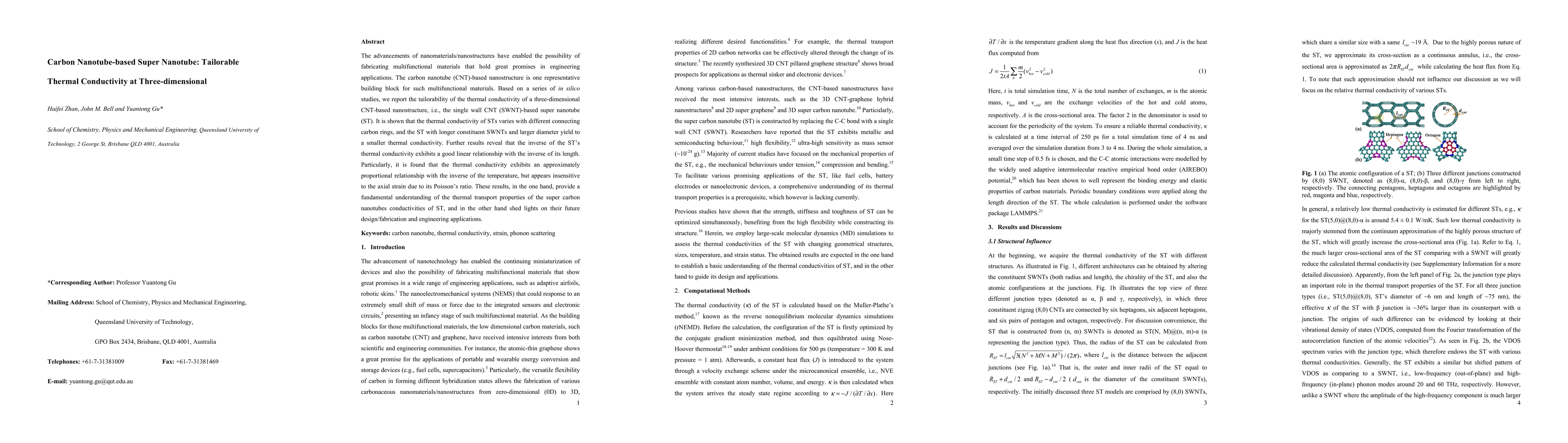 This paper reports on the tailorability of thermal conductivity in three-dimensional carbon nanotube-based super nanotubes (STs), revealing that conductivity varies with different carbon ring connections and is inversely proportional to the ST length and temperature. The study highlights potential for engineering applications based on these thermal transport properties.