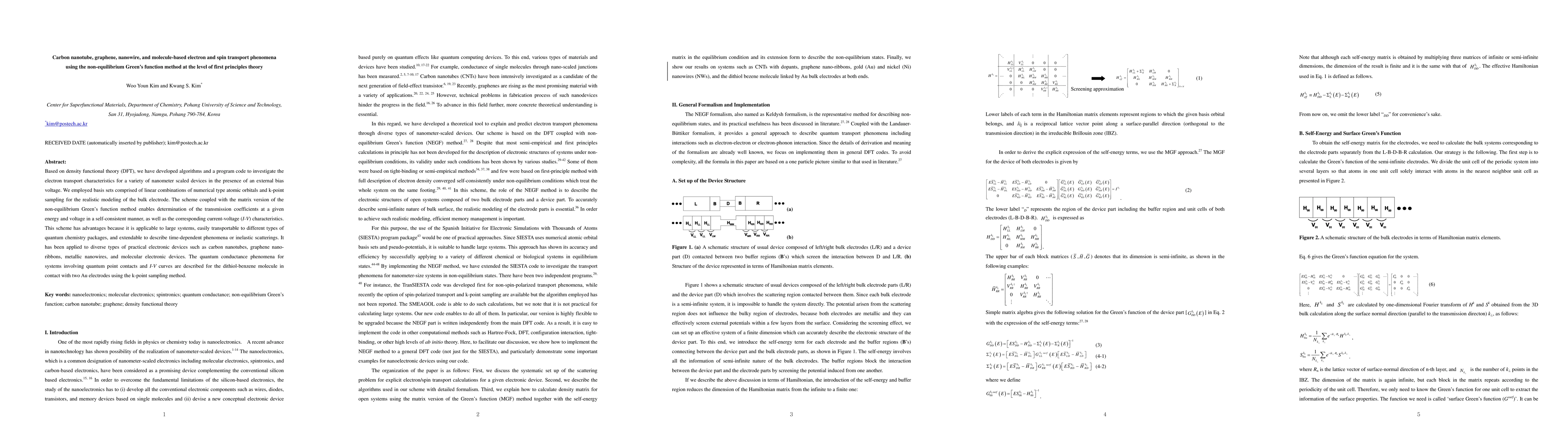 Based on density functional theory (DFT), we have developed algorithms and a program code to investigate the electron transport characteristics for a variety of nanometer scaled devices in the presence of an external bias voltage. We employed basis sets comprised of linear combinations of numerical type atomic orbitals and k-point sampling for the realistic modeling of the bulk electrode. The scheme coupled with the matrix version of the non-equilibrium Green function method enables determination of the transmission coefficients at a given energy and voltage in a self-consistent manner, as well as the corresponding current-voltage (I-V) characteristics. This scheme has advantages because it is applicable to large systems, easily transportable to different types of quantum chemistry packages, and extendable to describe time-dependent phenomena or inelastic scatterings. It has been applied to diverse types of practical electronic devices such as carbon nanotubes, graphene nano-ribbons, metallic nanowires, and molecular electronic devices. The quantum conductance phenomena for systems involving quantum point contacts and I-V curves are described for the dithiol-benzene molecule in contact with two Au electrodes using the k-point sampling method.