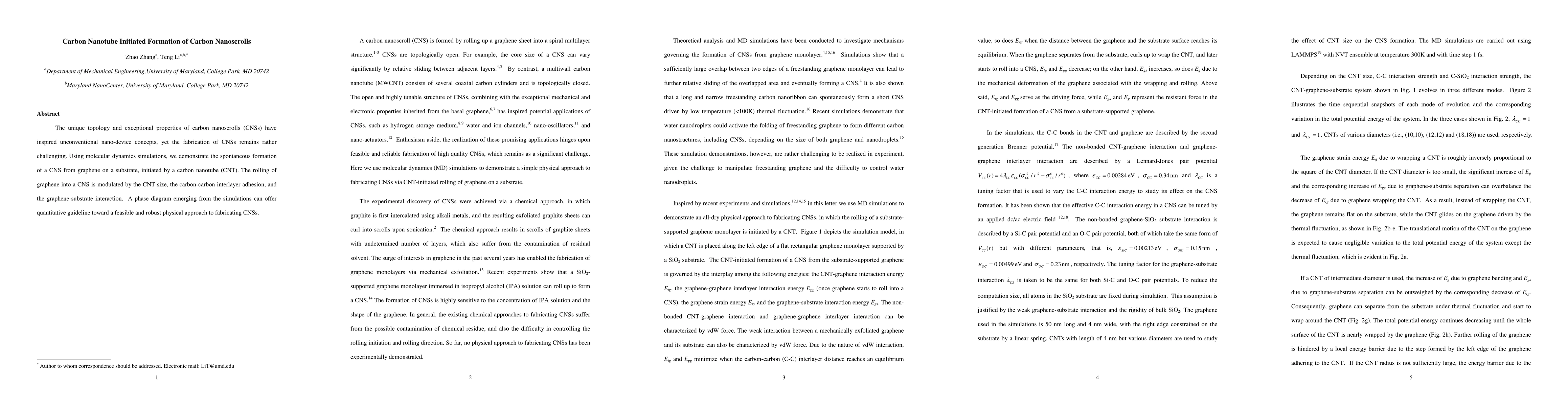 The paper presents a molecular dynamics simulation-based approach to understand and control the formation of carbon nanoscrolls from graphene using carbon nanotubes as initiators.