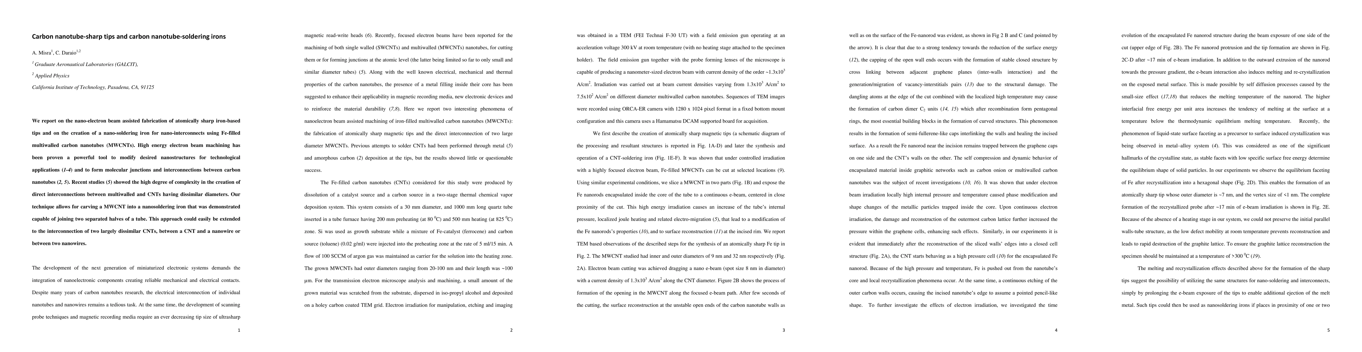 We report on the nano-electron beam assisted fabrication of atomically sharp iron-based tips and on the creation of a nano-soldering iron for nano-interconnects using Fe-filled multiwalled carbon nanotubes (MWCNTs). High energy electron beam machining has been proven a powerful tool to modify desired nanostructures for technological applications and to form molecular junctions and interconnections between carbon nanotubes. Recent studies showed the high degree of complexity in the creation of direct interconnections between multiwalled and CNTs having dissimilar diameters. Our technique allows for carving a MWCNT into a nanosoldering iron that was demonstrated capable of joining two separated halves of a tube. This approach could easily be extended to the interconnection of two largely dissimilar CNTs, between a CNT and a nanowire or between two nanowires.