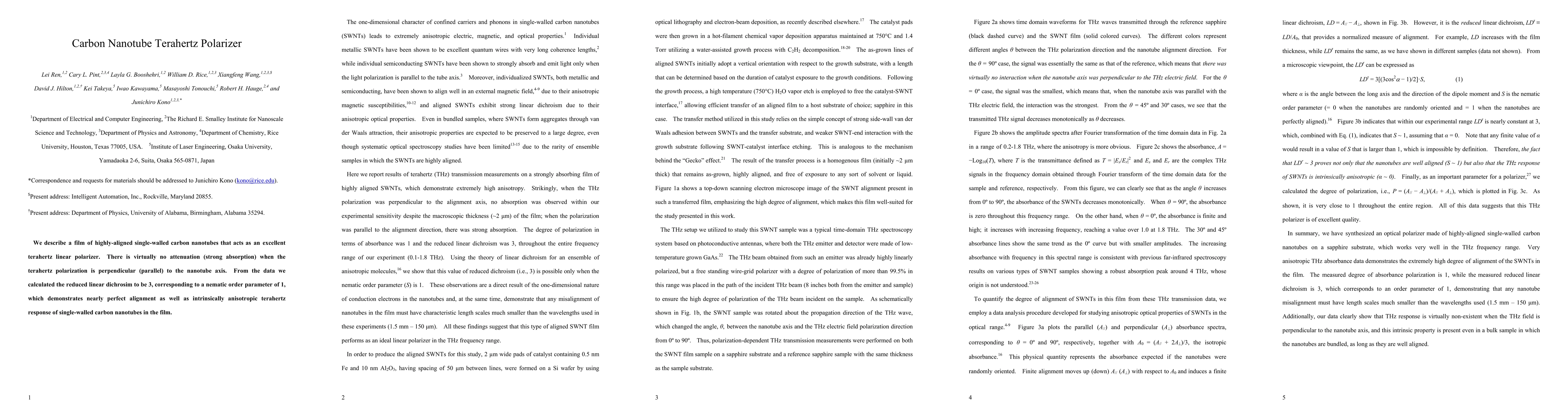 This research presents a highly-aligned single-walled carbon nanotube film functioning as an efficient terahertz linear polarizer with minimal attenuation, demonstrating a reduced linear dichroism of 3 and a nematic order parameter of 1, indicating near-perfect alignment and anisotropic terahertz response.