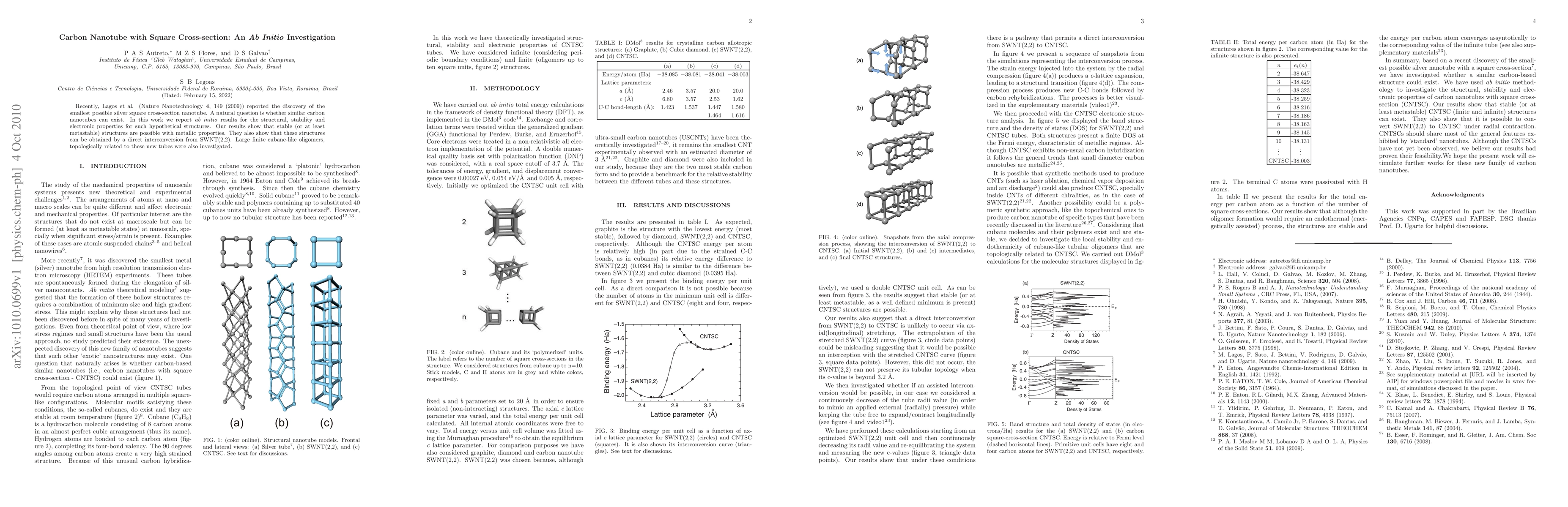 Recently, Lagos et al. (Nature Nanotechnology 4, 149 (2009)) reported the discovery of the smallest possible silver square cross-section nanotube. A natural question is whether similar carbon nanotubes can exist. In this work we report ab initio results for the structural, stability and electronic properties for such hypothetical structures. Our results show that stable (or at least metastable) structures are possible with metallic properties. They also show that these structures can be obtained by a direct interconversion from SWNT(2,2). Large finite cubane-like oligomers, topologically related to these new tubes were also investigated.