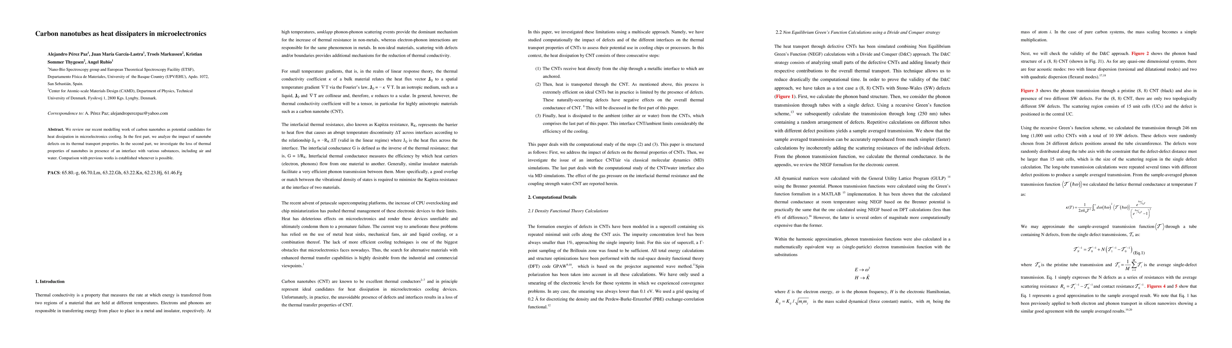 Summary: This paper models carbon nanotubes as effective heat dissipaters in microelectronics, analyzing how defects and interfaces with substances like air and water affect their thermal transport properties, and compares findings with prior research.