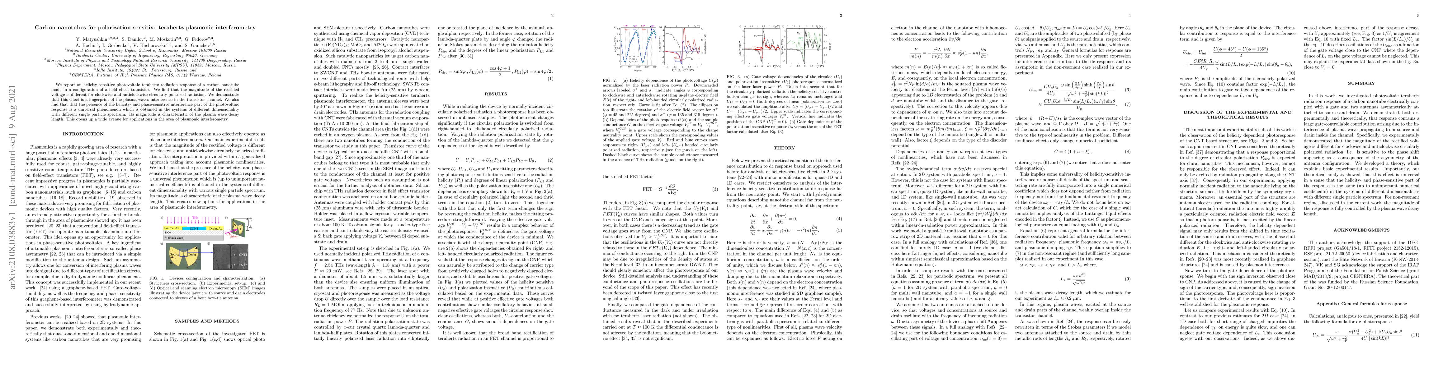 We report on helicity sensitive photovoltaic terahertz radiation response of a carbon nanotube made in a conguration of a field effect transistor. We find that the magnitude of the rectified voltage is different for clockwise and anticlockwise circularly polarized radiation. We demonstrate that this effect is a fingerprint of the plasma waves interference in the transistor channel. We also find that that the presence of the helicity- and phase-sensitive interference part of the photovoltaic response is a universal phenomenon which is obtained in the systems of different dimensionality with different single particle spectrum. Its magnitude is characteristic of the plasma wave decay length. This opens up a wide avenue for applications in the area of plasmonic interferometry.