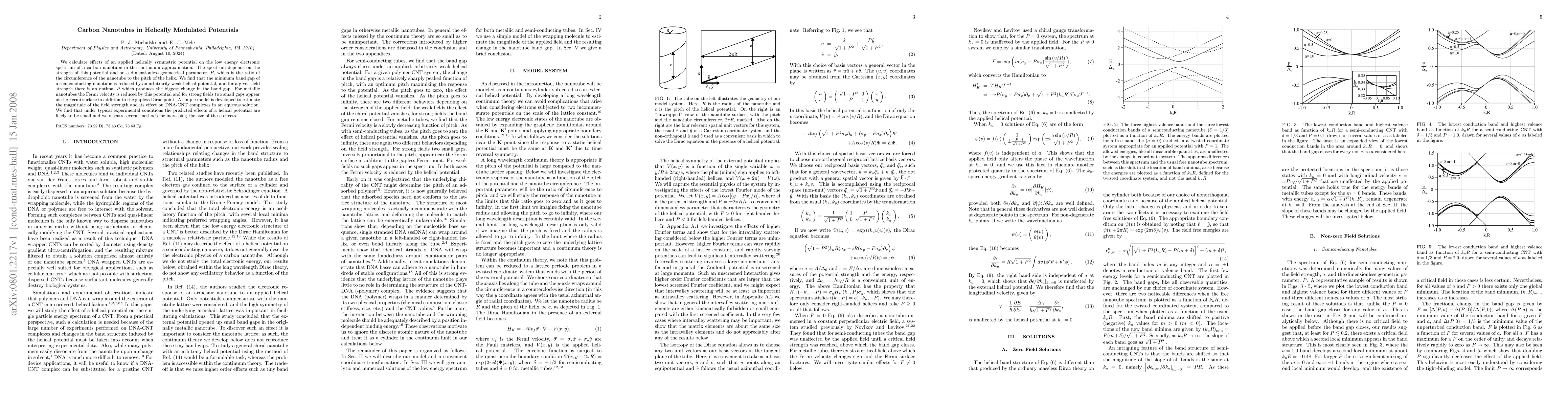 We calculate effects of an applied helically symmetric potential on the low energy electronic spectrum of a carbon nanotube in the continuum approximation. The spectrum depends on the strength of this potential and on a dimensionless geometrical parameter, P, which is the ratio of the circumference of the nanotube to the pitch of the helix. We find that the minimum band gap of a semiconducting nanotube is reduced by an arbitrarily weak helical potential, and for a given field strength there is an optimal P which produces the biggest change in the band gap. For metallic nanotubes the Fermi velocity is reduced by this potential and for strong fields two small gaps appear at the Fermi surface in addition to the gapless Dirac point. A simple model is developed to estimate the magnitude of the field strength and its effect on DNA-CNT complexes in an aqueous solution. We find that under typical experimental conditions the predicted effects of a helical potential are likely to be small and we discuss several methods for increasing the size of these effects.