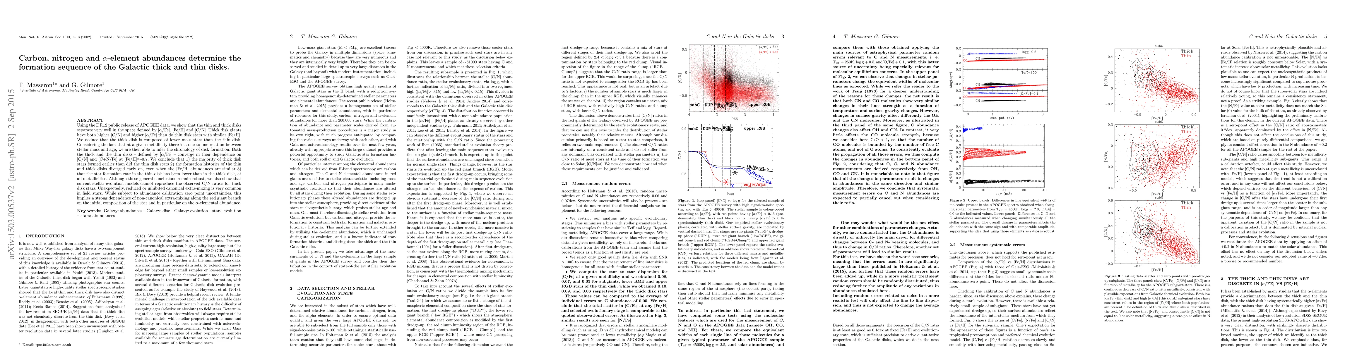 Using the DR12 public release of APOGEE data, we show that thin and thick disk separate very well in the space defined by [$\alpha$/Fe], [Fe/H] and [C/N]. Thick disk giants have both higher [C/N] and higher [$\alpha$/Fe] than do thin disk stars with similar [Fe/H]. We deduce that the thick disk is composed of lower mass stars than the thin disk. Considering the fact that at a given metallicity there is a one-to-one relation between stellar mass and age, we are then able to infer the chronology of disk formation. Both the thick and the thin disks - defined by [$\alpha$/Fe] -- converge in their dependance on [C/N] and [C+N/Fe] at [Fe/H]$\approx$-0.7. We conclude that 1) the majority of thick disk stars formed earlier than did the thin disk stars 2) the formation histories of the thin and thick disks diverged early on, even when the [Fe/H] abundances are similar 3) that the star formation rate in the thin disk has been lower than in the thick disk, at all metallicities. Although these general conclusions remain robust, we also show that current stellar evolution models cannot reproduce the observed C/N ratios for thick disk stars. Unexpectedly, reduced or inhibited canonical extra-mixing is very common in field stars. While subject to abundance calibration zeropoint uncertainties, this implies a strong dependence of non canonical extra-mixing along the red giant branch on the initial composition of the star and in particular on the $\alpha$ elemental abundance.