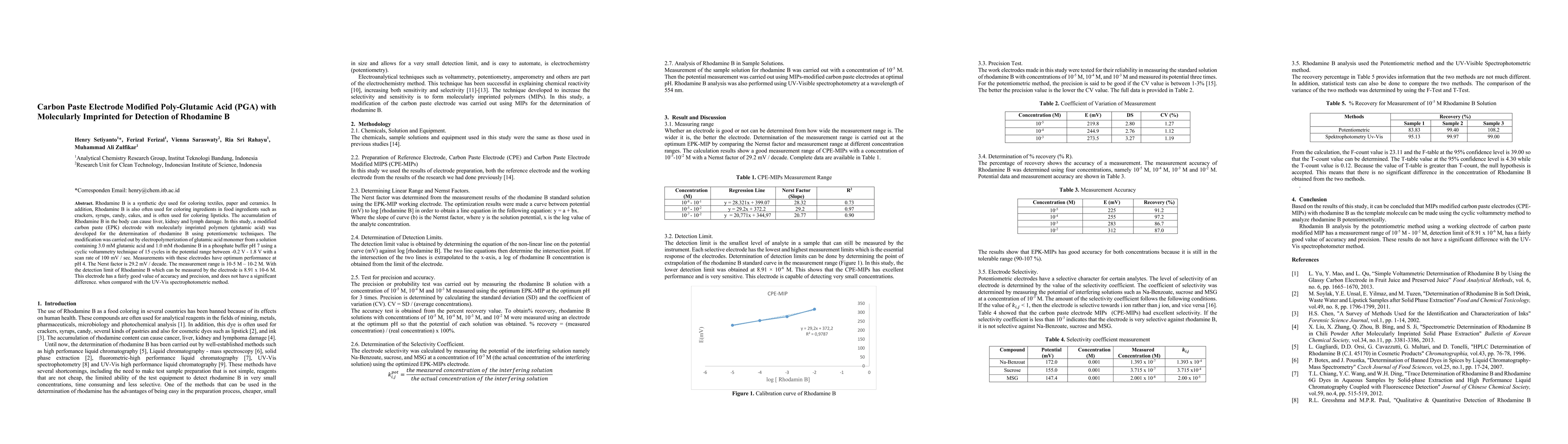 Rhodamine B is a synthetic dye used for coloring textiles, paper and ceramics. In addition, Rhodamine B is also often used for coloring ingredients in food ingredients such as crackers, syrups, candy, cakes, and is often used for coloring lipsticks. The accumulation of Rhodamine B in the body can cause liver, kidney and lymph damage. In this study, a modified carbon paste electrode (CPE) with molecularly imprinted polymers (glutamic acid) was developed for the determination of rhodamine B using potentiometric techniques. The modification was carried out by electropolymerization of glutamic acid monomer from a solution containing 3.0 mM glutamic acid and 1.0 mM rhodamine B in a phosphate buffer pH 7 using a cyclic voltammetry technique of 15 cycles in the potential range between (-0.2 V) to (1.8 V) with a scan rate of 100 mV/sec. Measurements with these electrodes have optimum performance at pH 4. The Nerst factor is 29.2 mV/decade. The measurement range is 10-5 M to 10-2 M. With the detection limit of Rhodamine B which can be measured by the electrode is 8.91 x 10-6 M. This electrode has a fairly good value of accuracy and precision, and does not have a significant difference. when compared with the UV-Vis spectrophotometric method.