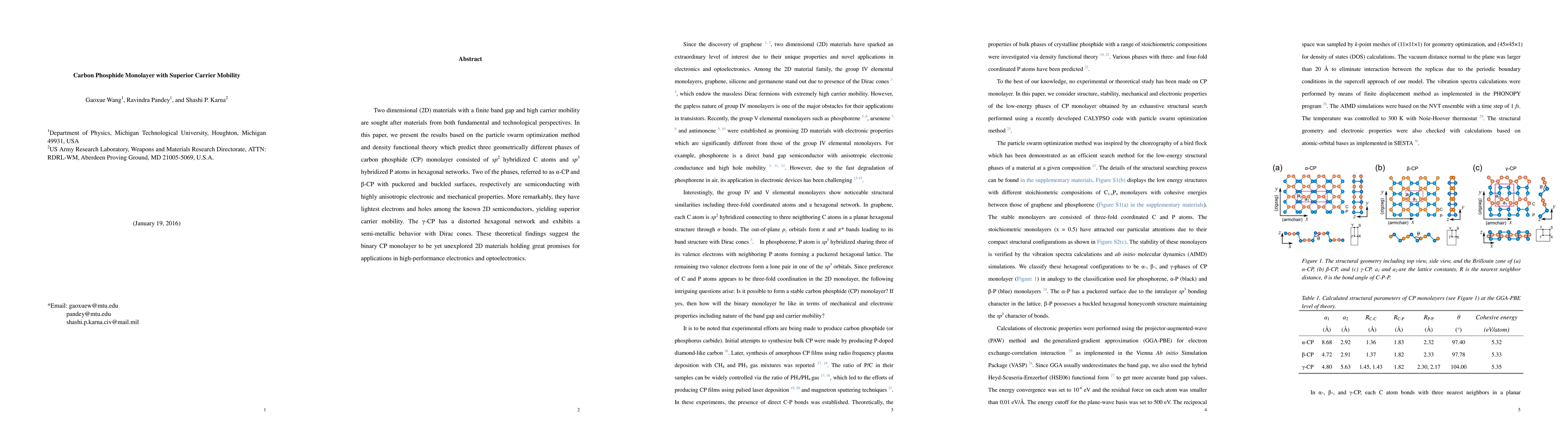 This paper utilizes particle swarm optimization and density functional theory to predict three phases of carbon phosphide monolayers, two of which exhibit semiconducting behavior and superior carrier mobility due to light electrons and holes, suggesting potential for high-performance electronics and optoelectronics. The third phase displays semi-metallic properties with Dirac cones.