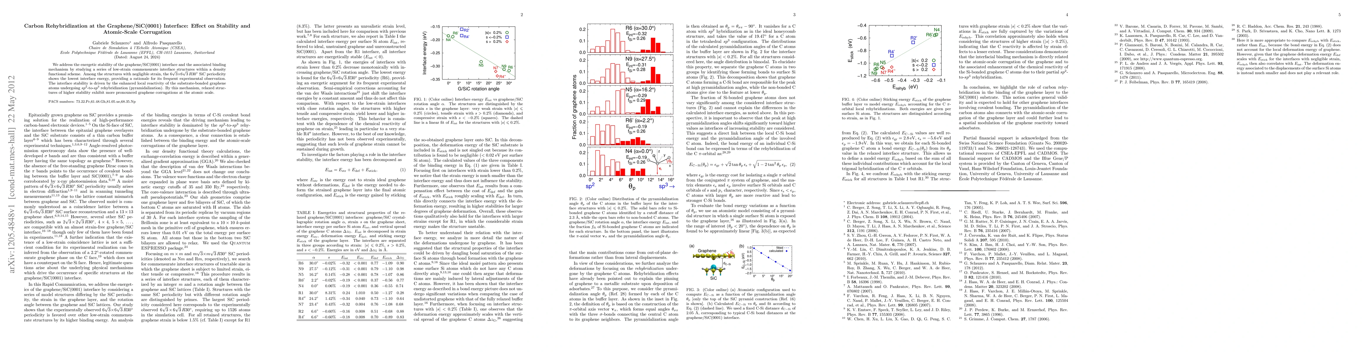 This paper investigates the stability of graphene on SiC(0001) interfaces, finding that the lowest energy configuration is characterized by sp2-to-sp3 rehybridization of graphene atoms, leading to enhanced stability and increased atomic-scale corrugation. The 6√3×6√3 R30° periodicity is identified as the most stable interface due to this rehybridization.