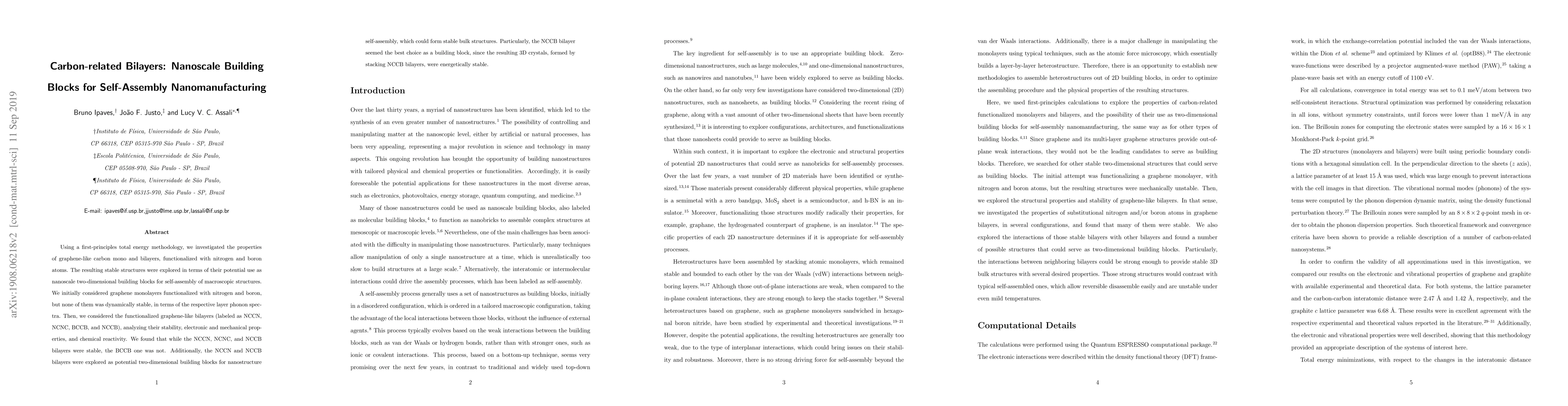 This study investigates stable functionalized graphene-like carbon bilayers (NCCN, NCNC, BCCB, NCCB) for nanoscale self-assembly, finding that while NCCN and NCCB are stable and suitable for constructing 3D crystals, only NCCB appears optimal due to its energetically stable 3D crystal formation.