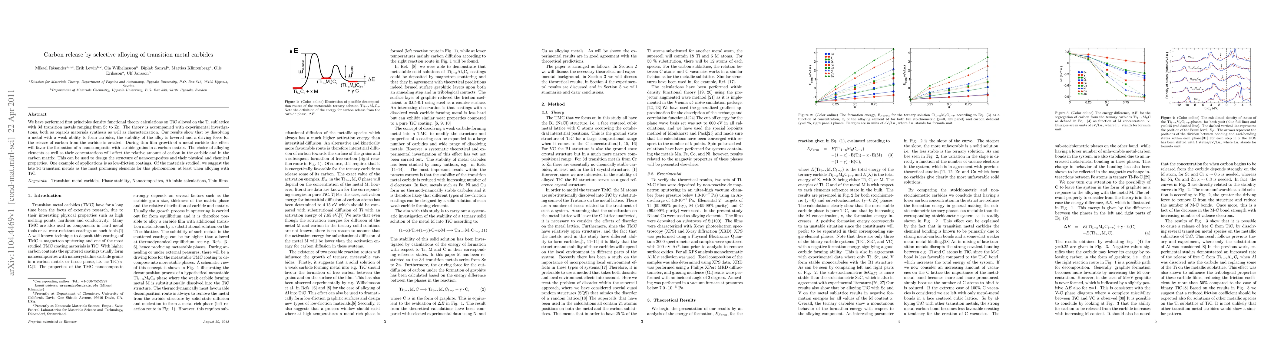 We have performed first principles density functional theory calculations on TiC alloyed on the Ti sublattice with 3d transition metals ranging from Sc to Zn. The theory is accompanied with experimental investigations, both as regards materials synthesis as well as characterization. Our results show that by dissolving a metal with a weak ability to form carbides, the stability of the alloy is lowered and a driving force for the release of carbon from the carbide is created. During thin film growth of a metal carbide this effect will favor the formation of a nanocomposite with carbide grains in a carbon matrix. The choice of alloying elements as well as their concentrations will affect the relative amount of carbon in the carbide and in the carbon matrix. This can be used to design the structure of nanocomposites and their physical and chemical properties. One example of applications is as low-friction coatings. Of the materials studied, we suggest the late 3d transition metals as the most promising elements for this phenomenon, at least when alloying with TiC.