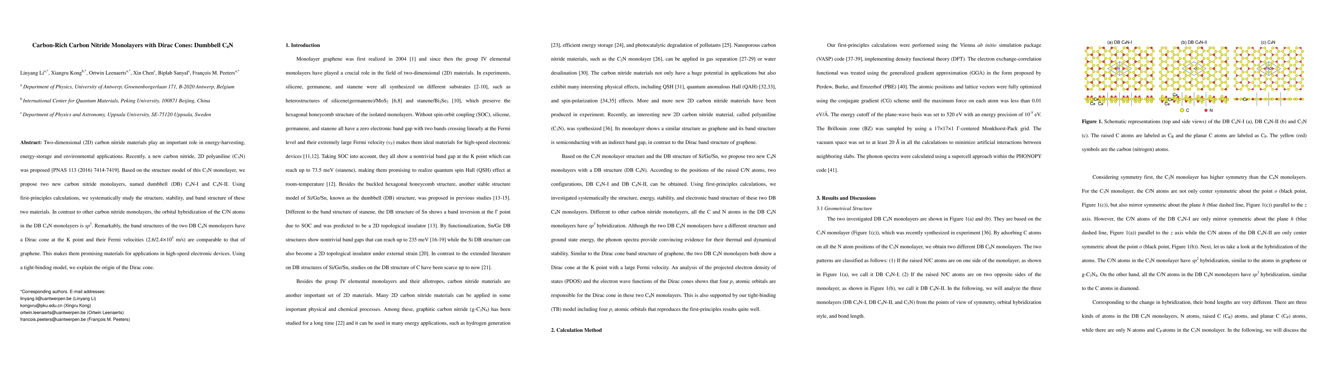 This paper proposes two new carbon nitride monolayers, dumbbell C4N-I and C4N-II, which exhibit Dirac cones and sp3 orbital hybridization, making them promising for high-speed electronic devices. The study uses first-principles calculations and a tight-binding model to explain their unique electronic properties.