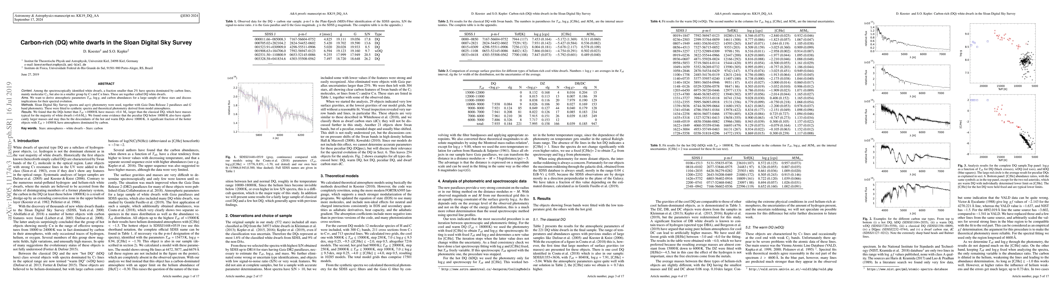 This paper investigates carbon-rich (DQ) white dwarfs, finding that those with effective temperatures above 10000 K have masses around 0.4 Msun, significantly larger than the cooler DQs (~0.6 Msun). The study uses SDSS and GAIA data to derive atmospheric parameters and carbon abundances, revealing that hotter DQs often have carbon-dominated atmospheres.