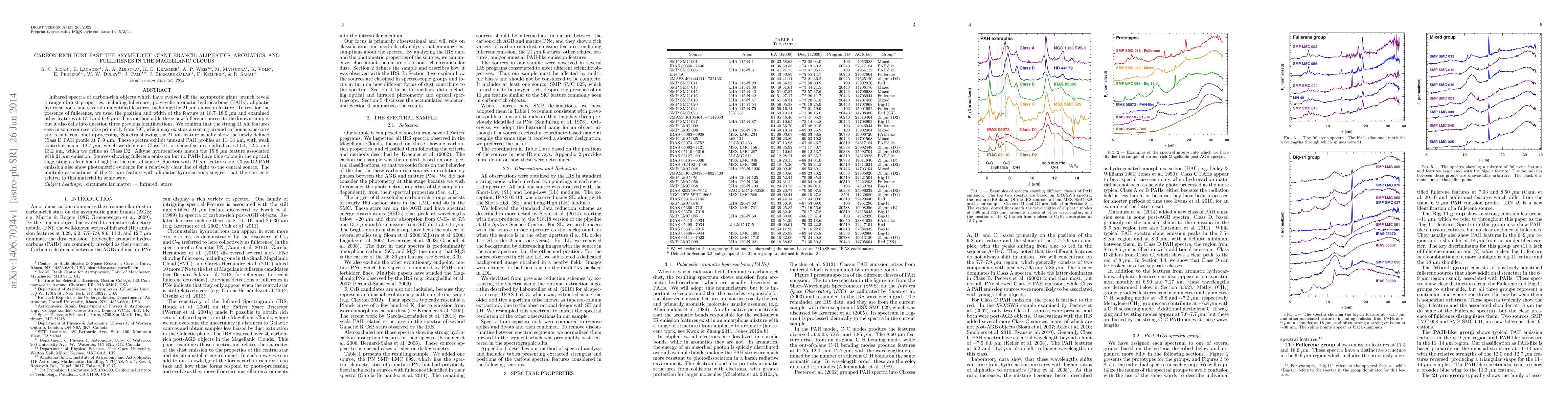 Infrared spectra of carbon-rich objects which have evolved off the asymptotic giant branch reveal a range of dust properties, including fullerenes, polycyclic aromatic hydrocarbons (PAHs), aliphatic hydrocarbons, and several unidentified features, including the 21 um emission feature. To test for the presence of fullerenes, we used the position and width of the feature at 18.7-18.9 um and examined other features at 17.4 and 6-9 um. This method adds three new fullerene sources to the known sample, but it also calls into question three previous identifications. We confirm that the strong 11 um features seen in some sources arise primarily from SiC, which may exist as a coating around carbonaceous cores and result from photo-processing. Spectra showing the 21 um feature usually show the newly defined Class D PAH profile at 7-9 um. These spectra exhibit unusual PAH profiles at 11-14 um, with weak contributions at 12.7 um, which we define as Class D1, or show features shifted to ~11.4, 12.4, and 13.2 um, which we define as Class D2. Alkyne hydrocarbons match the 15.8 um feature associated with 21 um emission. Sources showing fullerene emission but no PAHs have blue colors in the optical, suggesting a clear line of sight to the central source. Spectra with 21 um features and Class D2 PAH emission also show photometric evidence for a relatively clear line of sight to the central source. The multiple associations of the 21 um feature to aliphatic hydrocarbons suggest that the carrier is related to this material in some way.