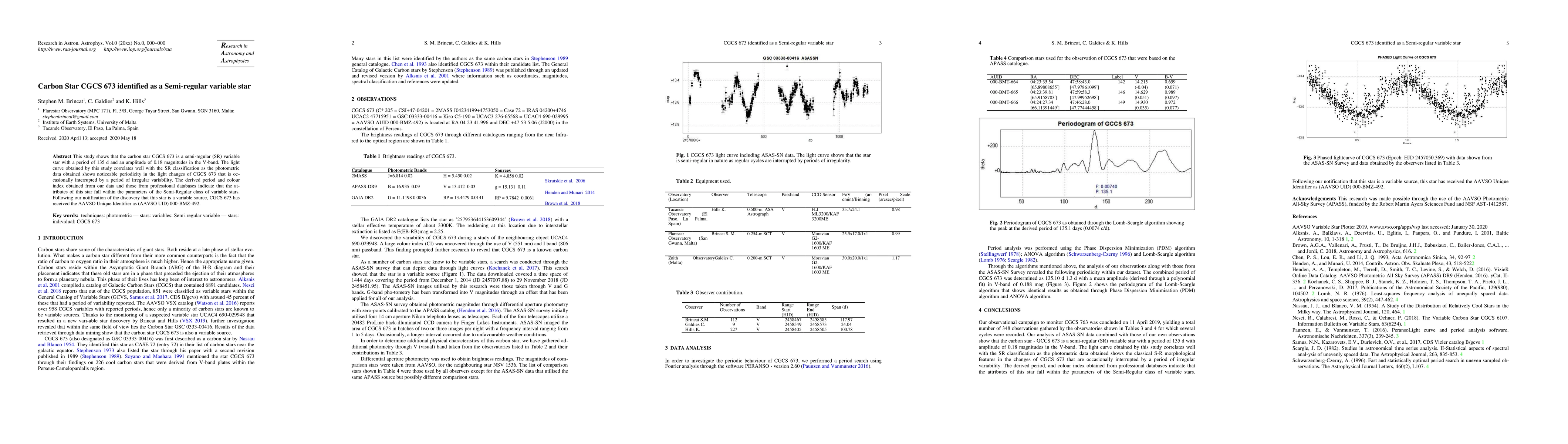 The carbon star CGCS 673 has been identified as a semi-regular variable star with a 135-day period and 0.18 magnitude amplitude in the V-band. Its light curve, displaying periodic changes with irregular interruptions, confirms its SR classification, aligning with established parameters.