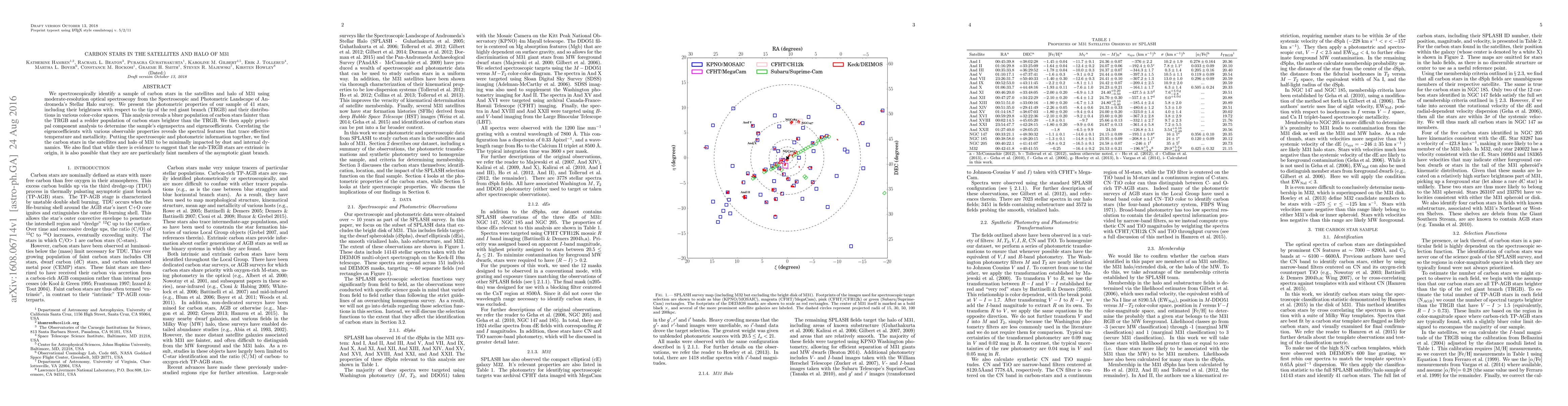 We spectroscopically identify a sample of carbon stars in the satellites and halo of M31 using moderate-resolution optical spectroscopy from the Spectroscopic and Photometric Landscape of Andromeda's Stellar Halo survey. We present the photometric properties of our sample of 41 stars, including their brightness with respect to the tip of the red giant branch (TRGB) and their distributions in various color-color spaces. This analysis reveals a bluer population of carbon stars fainter than the TRGB and a redder population of carbon stars brighter than the TRGB. We then apply principal component analysis to determine the sample's eigenspectra and eigencoefficients. Correlating the eigencoefficients with various observable properties reveals the spectral features that trace effective temperature and metallicity. Putting the spectroscopic and photometric information together, we find the carbon stars in the satellites and halo of M31 to be minimally impacted by dust and internal dynamics. We also find that while there is evidence to suggest that the sub-TRGB stars are extrinsic in origin, it is also possible that they are are particularly faint members of the asymptotic giant branch.