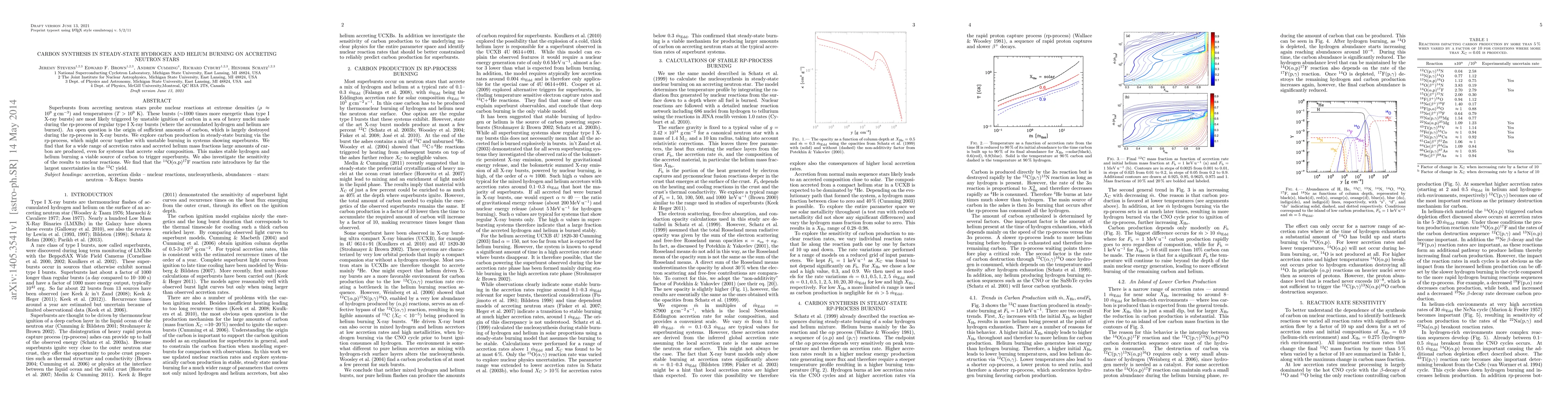 This paper investigates carbon synthesis during steady-state hydrogen and helium burning in accreting neutron stars, finding that significant carbon production occurs via the rp-process, even for solar composition accreted material. The study highlights that the $^{14}$O($\alpha$,p)$^{17}$F reaction rate is the main source of uncertainty in carbon yield predictions.