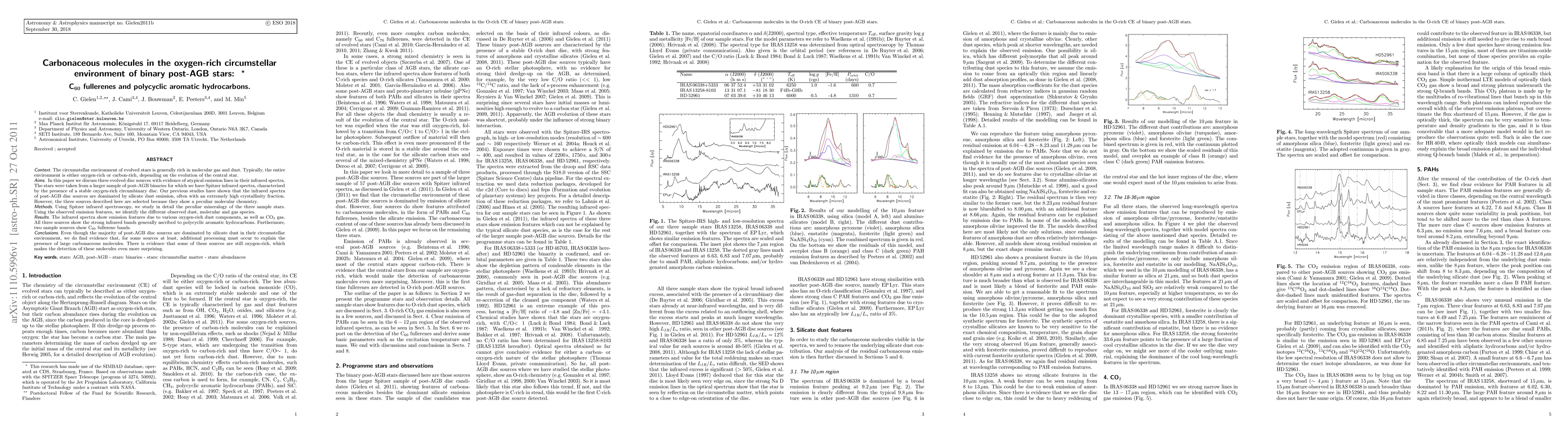 Context. The circumstellar environment of evolved stars is generally rich in molecular gas and dust. Typically, the entire environment is either oxygen-rich or carbon-rich, depending on the evolution of the central star. Aims. In this paper we discuss three evolved disc sources with evidence of atypical emission lines in their infrared spectra. The stars were taken from a larger sample of post-AGB binaries for which we have Spitzer infrared spectra, characterised by the presence of a stable oxygen-rich circumbinary disc. Our previous studies have shown that the infrared spectra of post-AGB disc sources are dominated by silicate dust emission, often with an extremely high crystallinity fraction. However, the three sources described here are selected because they show a peculiar molecular chemistry. Methods. Using Spitzer infrared spectroscopy, we study in detail the peculiar mineralogy of the three sample stars. Using the observed emission features, we identify the different observed dust, molecular and gas species. Results. The infrared spectra show emission features due to various oxygen-rich dust components, as well as CO2 gas. All three sources show the strong infrared bands generally ascribed to polycyclic aromatic hydrocarbons. Furthermore, two sample sources show C60 fullerene bands. Conclusions. Even though the majority of post-AGB disc sources are dominated by silicate dust in their circumstellar environment, we do find evidence that, for some sources at least, additional processing must occur to explain the presence of large carbonaceous molecules. There is evidence that some of these sources are still oxygen-rich, which makes the detection of these molecules even more surprising.