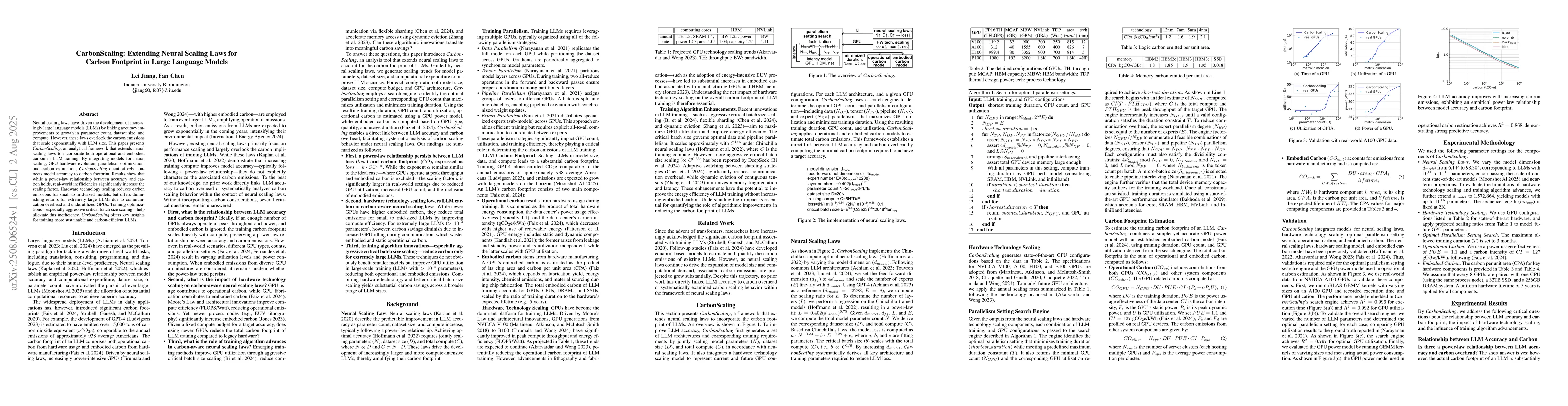 Neural scaling laws have driven the development of increasingly large language models (LLMs) by linking accuracy improvements to growth in parameter count, dataset size, and compute. However, these laws overlook the carbon emissions that scale exponentially with LLM size. This paper presents \textit{CarbonScaling}, an analytical framework that extends neural scaling laws to incorporate both operational and embodied carbon in LLM training. By integrating models for neural scaling, GPU hardware evolution, parallelism optimization, and carbon estimation, \textit{CarbonScaling} quantitatively connects model accuracy to carbon footprint. Results show that while a power-law relationship between accuracy and carbon holds, real-world inefficiencies significantly increase the scaling factor. Hardware technology scaling reduces carbon emissions for small to mid-sized models, but offers diminishing returns for extremely large LLMs due to communication overhead and underutilized GPUs. Training optimizations-especially aggressive critical batch size scaling-help alleviate this inefficiency. \textit{CarbonScaling} offers key insights for training more sustainable and carbon-efficient LLMs.