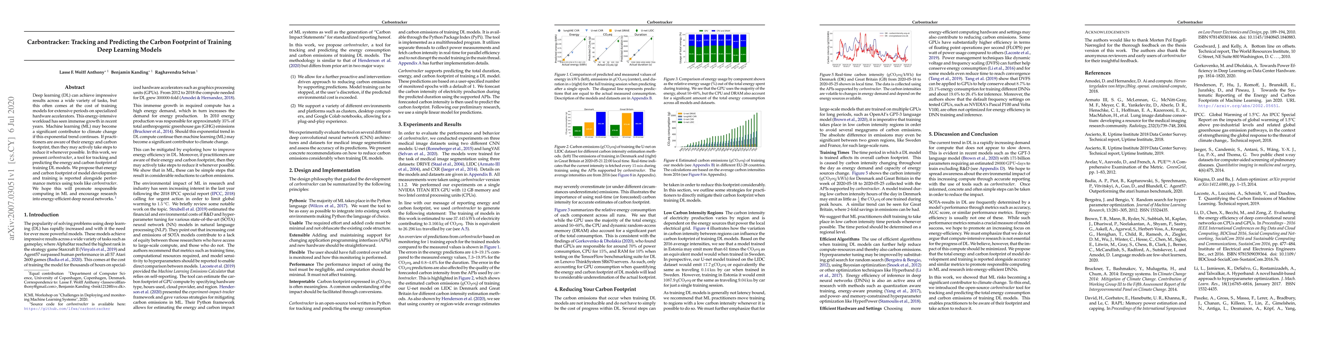 Carbontracker is a tool designed to track and predict the energy and carbon footprint of training deep learning models, aiming to promote responsible computing in machine learning by encouraging the reporting of these metrics alongside performance metrics. This initiative seeks to foster research into more energy-efficient deep neural networks.