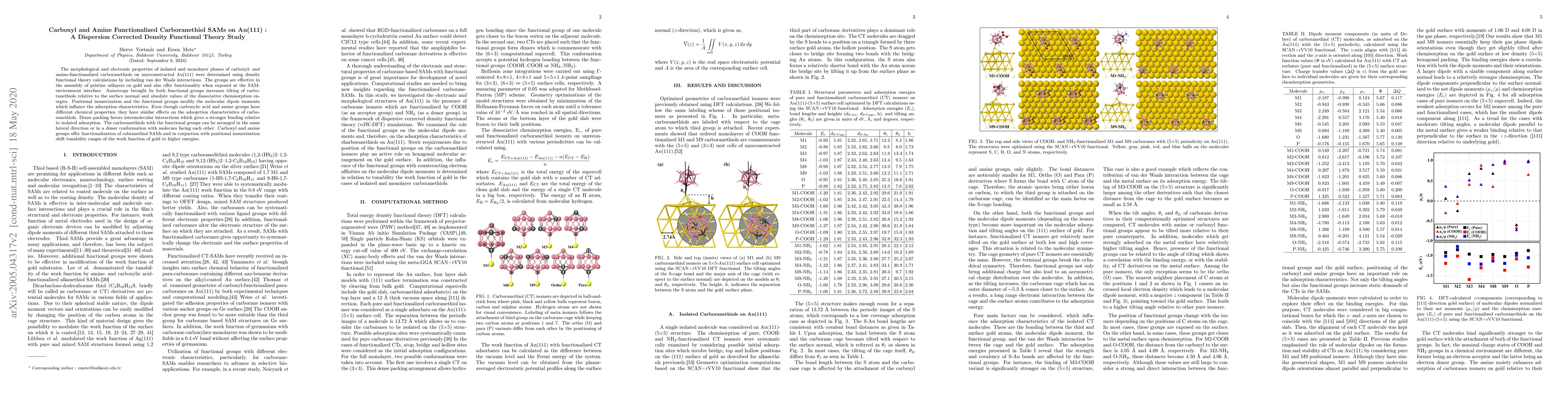 The morphological and electronic properties of isolated and monolayer phases of carboxyl- and amine-functionalized carboranethiols on unreconstructed Au(111) were determined using density functional theory calculations by including van der Waals interactions. The groups are effective in the assembly of pristine adlayers on gold and also offer functionality when exposed at the SAM-environment interface. Anisotropy brought by both functional groups increases tilting of carboranethiols relative to the surface normal and absolute values of the dissociative chemisorption energies. Positional isomerization and the functional groups modify the molecular dipole moments which influnce the adsorption characteristics. Even though carboxylic acid and amine groups have different chemical properties, they have similar effects on the adsoprtion characteristics of carboranethiols. Dense packing favors intermolecular interactions which gives a stronger binding relative to isolated adsorption. The carboranethiols with the functional groups can be arranged in the same lateral direction or in a dimer conformation with molecues facing each other. Carboxyl and amine groups offer functionalization of cabranethiol SAMs and in conjuction with positional isomerization shift tunability ranges of the work function of gold to higher energies.