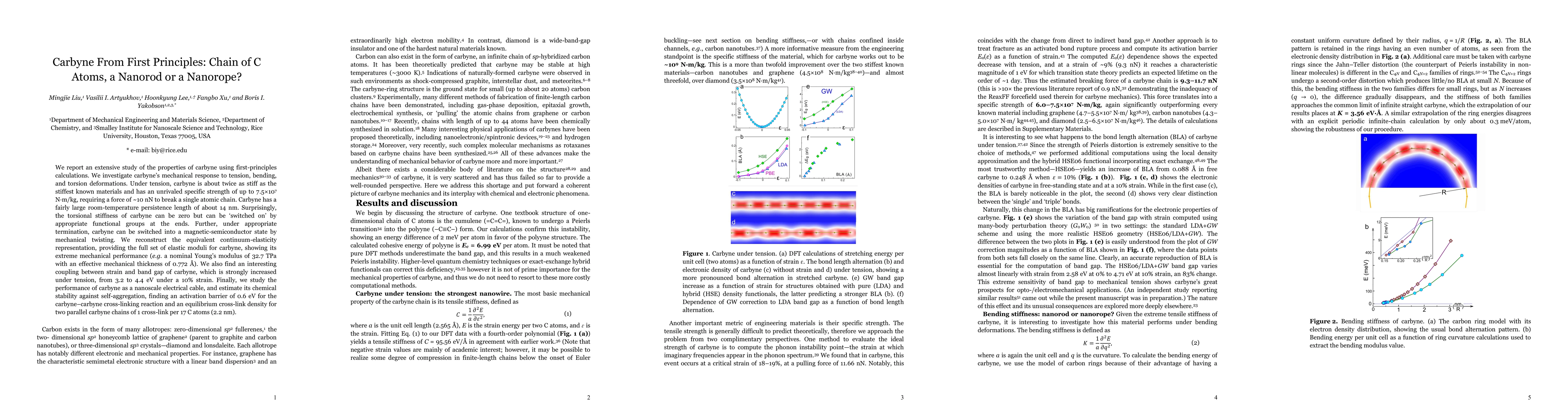 This study reveals carbyne's extraordinary mechanical properties, including exceptional stiffness and strength, with a Young's modulus of 32.7 TPa, and its ability to switch between torsional stiffness and magnetic-semiconductor states through functionalization and mechanical twisting. The research also highlights carbyne's potential as a nanoscale electrical cable and its chemical stability against self-aggregation.