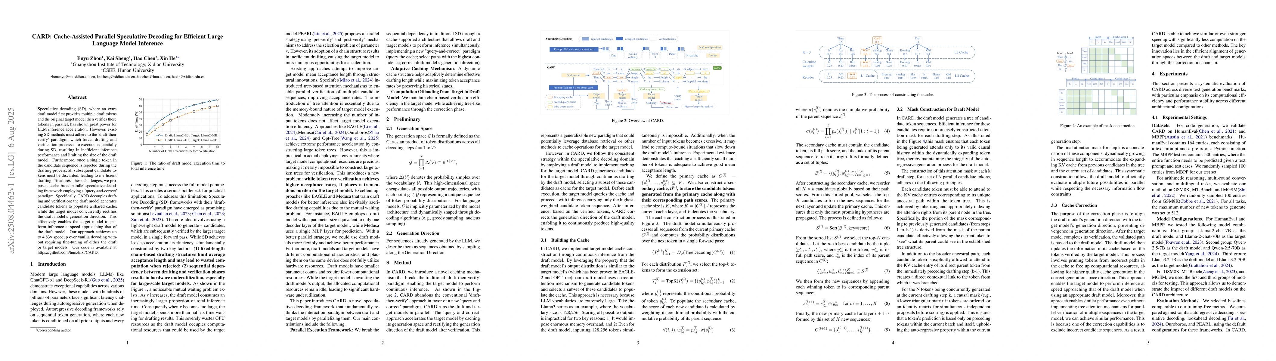 Speculative decoding (SD), where an extra draft model first provides multiple draft tokens and the original target model then verifies these tokens in parallel, has shown great power for LLM inference acceleration. However, existing SD methods must adhere to the 'draft-then-verify' paradigm, which forces drafting and verification processes to execute sequentially during SD, resulting in inefficient inference performance and limiting the size of the draft model. Furthermore, once a single token in the candidate sequence is rejected during the drafting process, all subsequent candidate tokens must be discarded, leading to inefficient drafting. To address these challenges, we propose a cache-based parallel speculative decoding framework employing a 'query-and-correct' paradigm. Specifically, CARD decouples drafting and verification: the draft model generates candidate tokens to populate a shared cache, while the target model concurrently rectifies the draft model's generation direction. This effectively enables the target model to perform inference at speed approaching that of the draft model. Our approach achieves up to 4.83 speedup over vanilla decoding without requiring fine-tuning of either the draft or target models. Our code is available at https://github.com/hunzhizi/CARD.