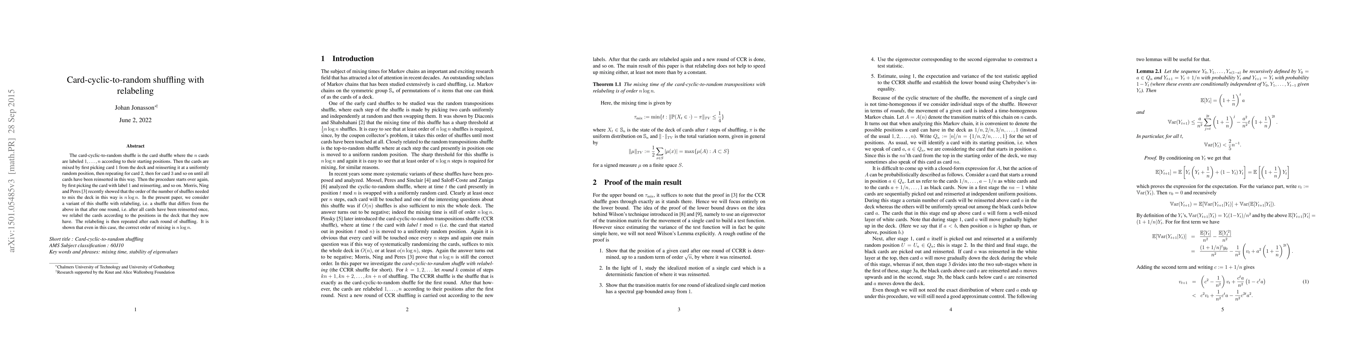 This paper examines a variant of the card-cyclic-to-random shuffle where cards are relabeled after each round according to their new positions, and shows that the number of shuffles needed to adequately mix the deck remains $n\log n$.