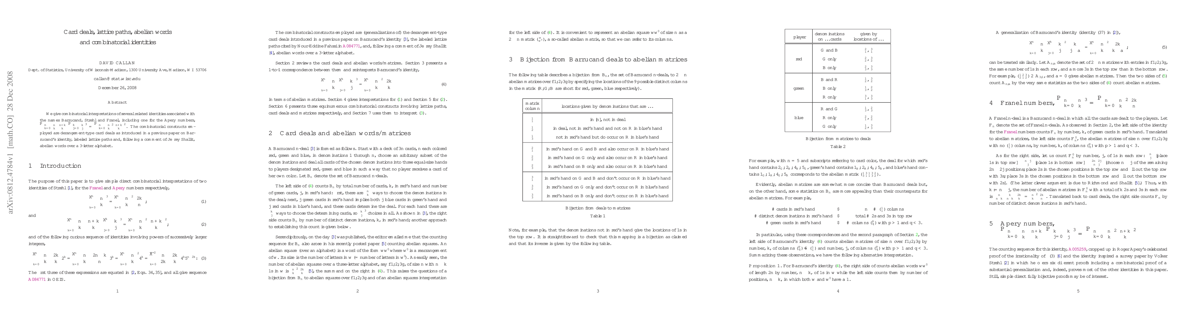 This paper provides combinatorial interpretations for several identities, including the Barrucand, Strehl, Franel, and Apery numbers, using constructs like derangement-type card deals, labeled lattice paths, and abelian words over a 3-letter alphabet. These interpretations reveal underlying connections between different combinatorial structures.