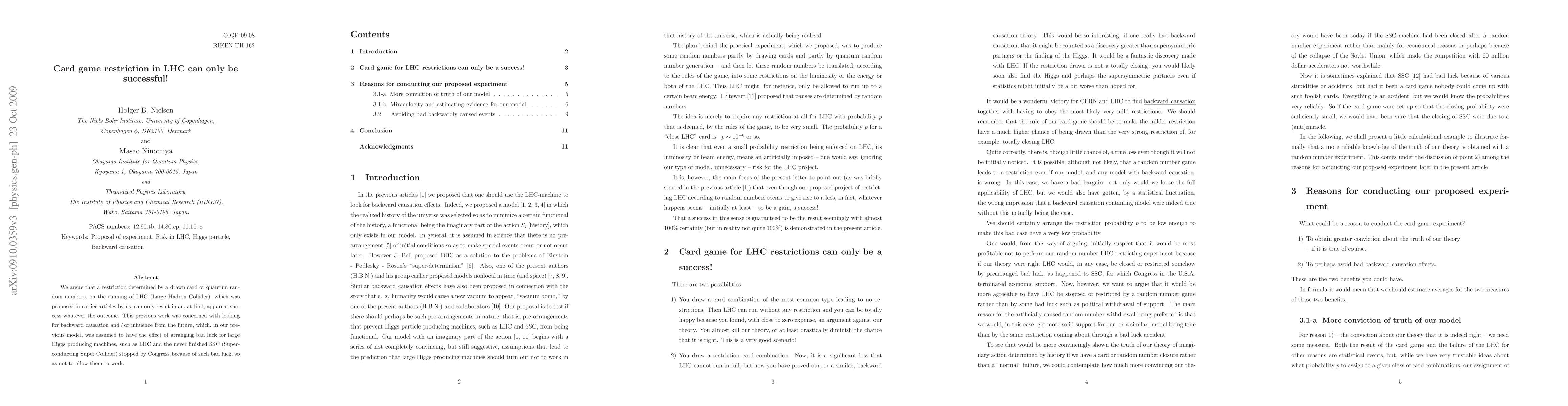We argue that a restriction determined by a drawn card or quantum random numbers, on the running of LHC (Large Hadron Collider), which was proposed in earlier articles by us, can only result in an, at first, apparent success whatever the outcome. This previous work was concerned with looking for backward causation and/or influence from the future, which, in our previous model, was assumed to have the effect of arranging bad luck for large Higgs producing machines, such as LHC and the never finished SSC (Superconducting Super Collider) stopped by Congress because of such bad luck, so as not to allow them to work.