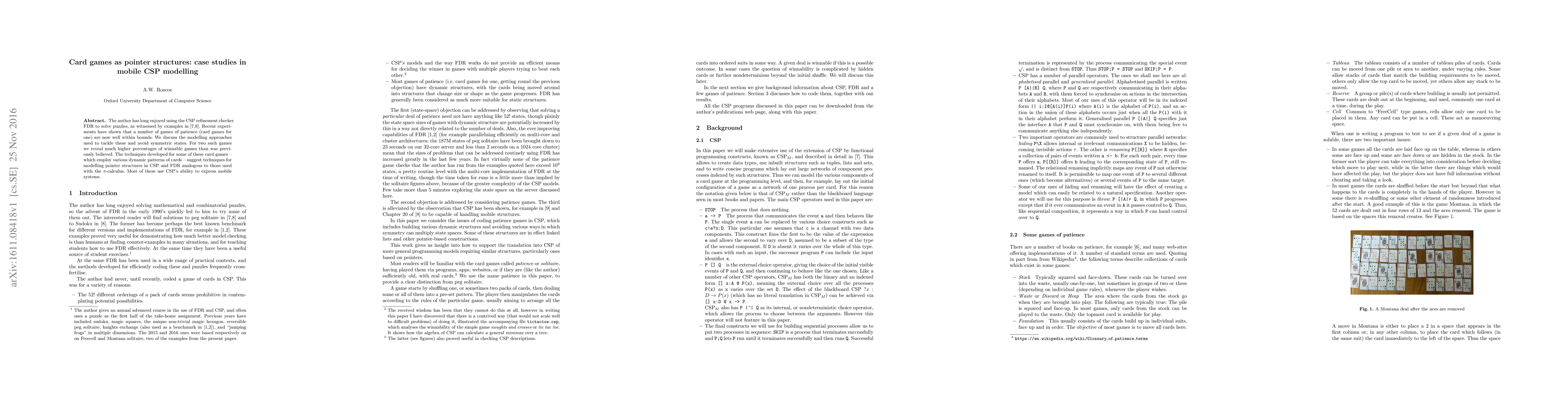 Researchers found that card games can be successfully modeled as pointer structures using CSP, revealing a higher percentage of winnable games than previously believed. These findings suggest new techniques for modeling mobile systems in CSP.