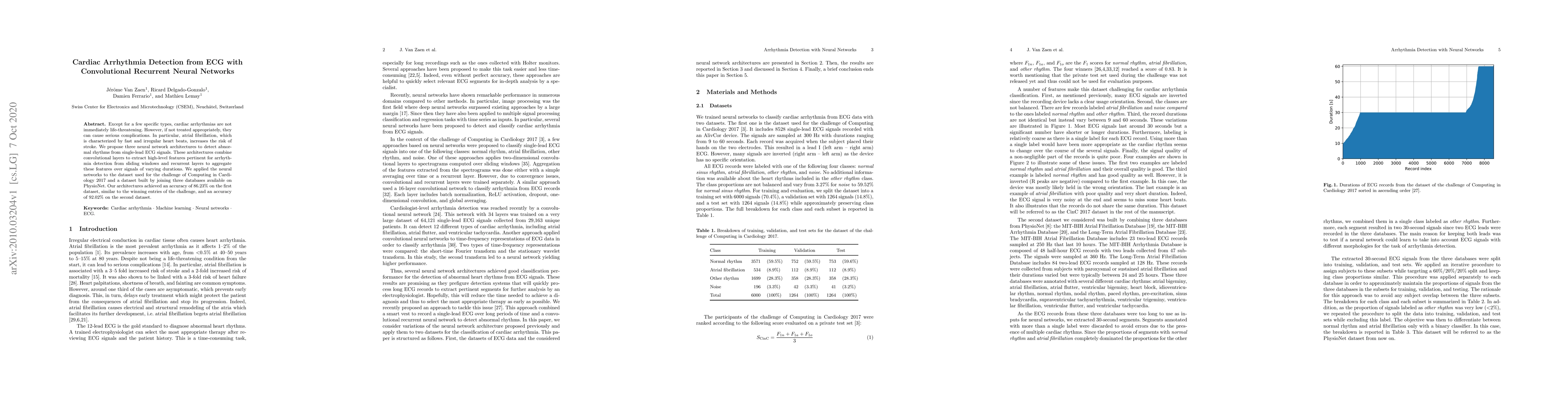 This paper proposes three neural network architectures combining convolutional and recurrent layers to detect cardiac arrhythmias from single-lead ECG signals. The models achieved high accuracy on two datasets, comparable to the best performing systems in the Computing in Cardiology 2017 challenge.