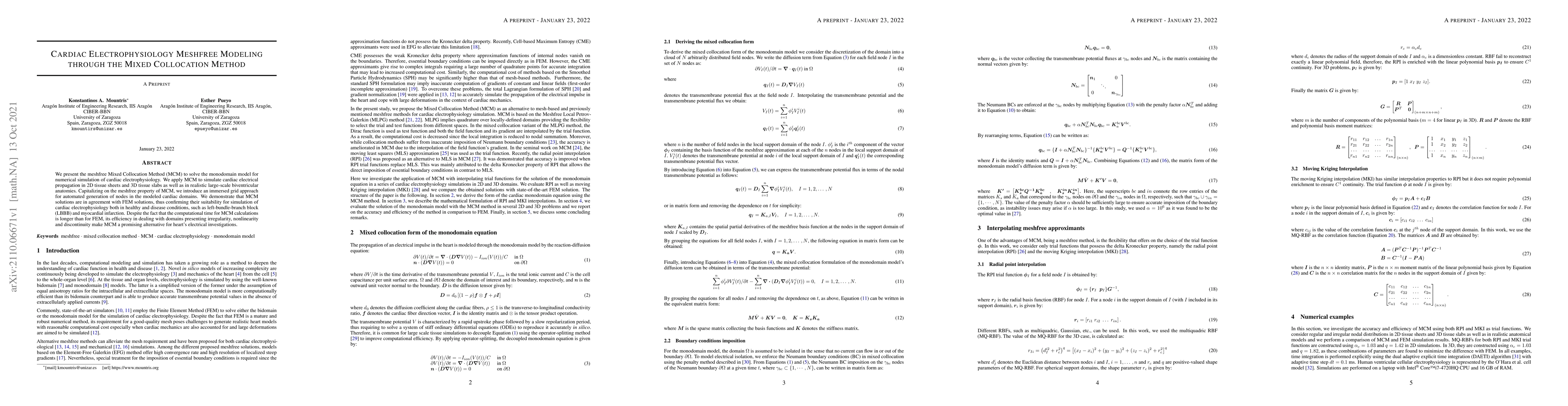 This paper introduces the Meshfree Mixed Collocation Method (MCM) to simulate cardiac electrophysiology, demonstrating its application in 2D and 3D tissue models and large-scale biventricular anatomies. While computational time is longer than with FEM, MCM's meshfree nature and suitability for irregular domains make it a promising alternative for cardiac electrical simulations.