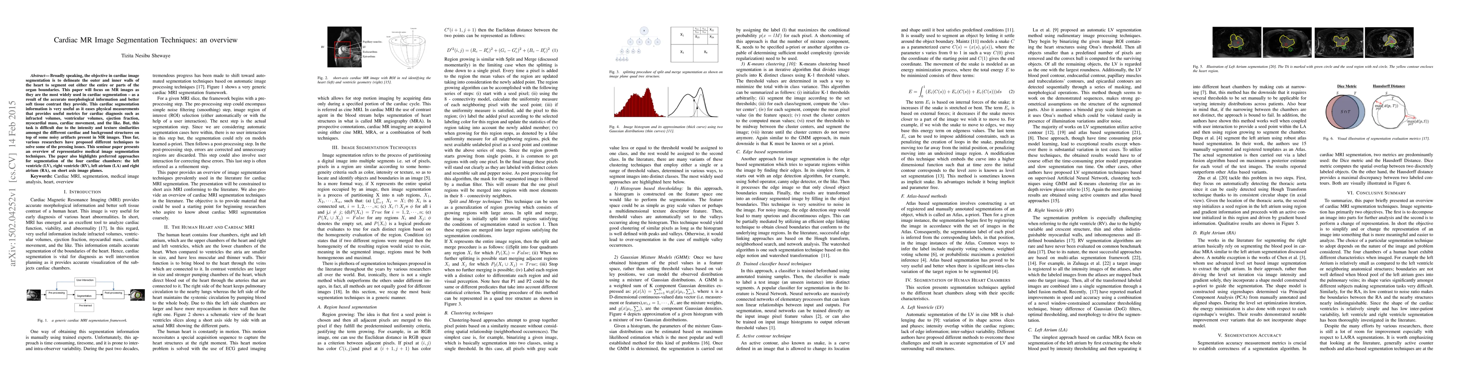 Broadly speaking, the objective in cardiac image segmentation is to delineate the outer and inner walls of the heart to segment out either the entire or parts of the organ boundaries. This paper will focus on MR images as they are the most widely used in cardiac segmentation -- as a result of the accurate morphological information and better soft tissue contrast they provide. This cardiac segmentation information is very useful as it eases physical measurements that provides useful metrics for cardiac diagnosis such as infracted volumes, ventricular volumes, ejection fraction, myocardial mass, cardiac movement, and the like. But, this task is difficult due to the intensity and texture similarities amongst the different cardiac and background structures on top of some noisy artifacts present in MR images. Thus far, various researchers have proposed different techniques to solve some of the pressing issues. This seminar paper presents an overview of representative medical image segmentation techniques. The paper also highlights preferred approaches for segmentation of the four cardiac chambers: the left ventricle (LV), right ventricle (RV), left atrium (LA) and right atrium (RA), on short axis image planes.