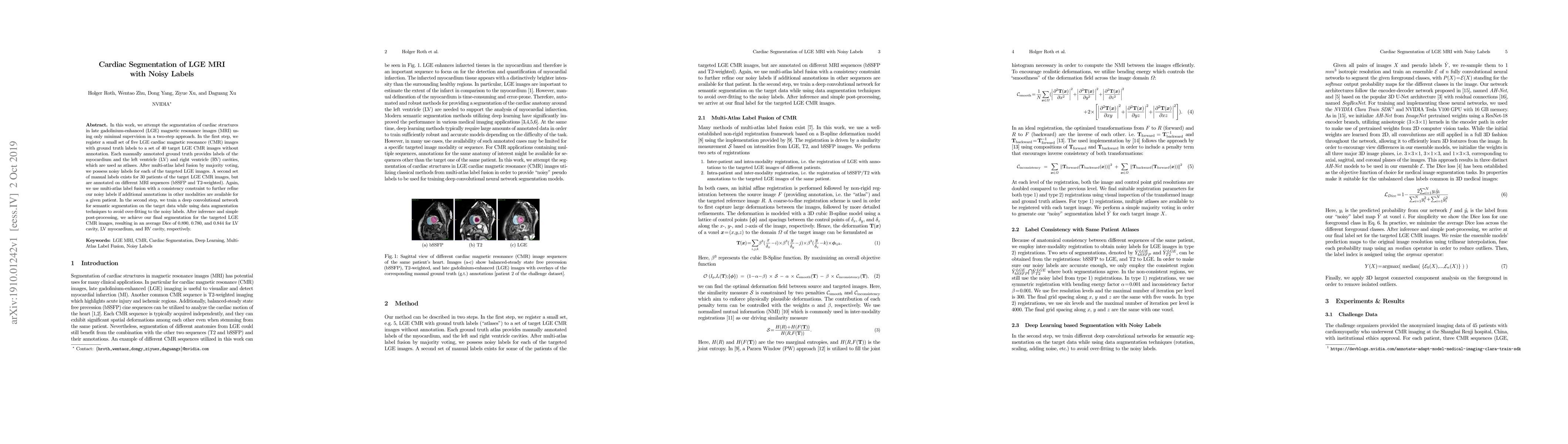 The paper presents a novel method for cardiac segmentation of LGE MRI using a two-step approach combining multi-atlas label fusion with deep learning-based segmentation, specifically designed to handle noisy labels.