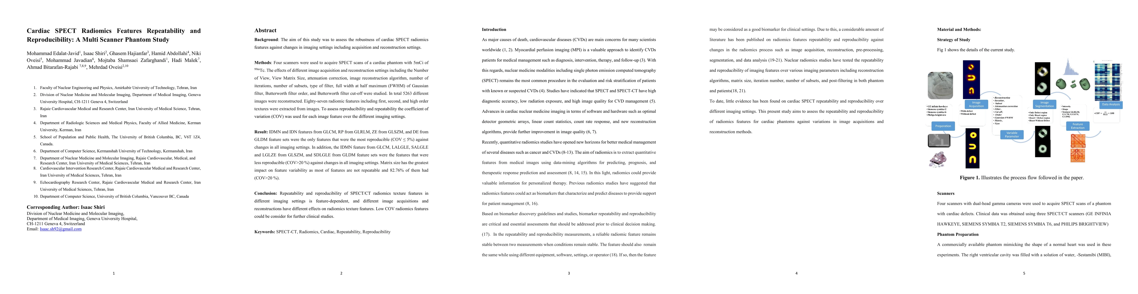 This study evaluates the repeatability and reproducibility of cardiac SPECT radiomics features across different imaging settings using a phantom. Key reproducible features (COV < 5) include IDMN and IDN from GLCM, RP from GLRLM, and others, while matrix size significantly impacts feature variability, with most features having high COV (>20).