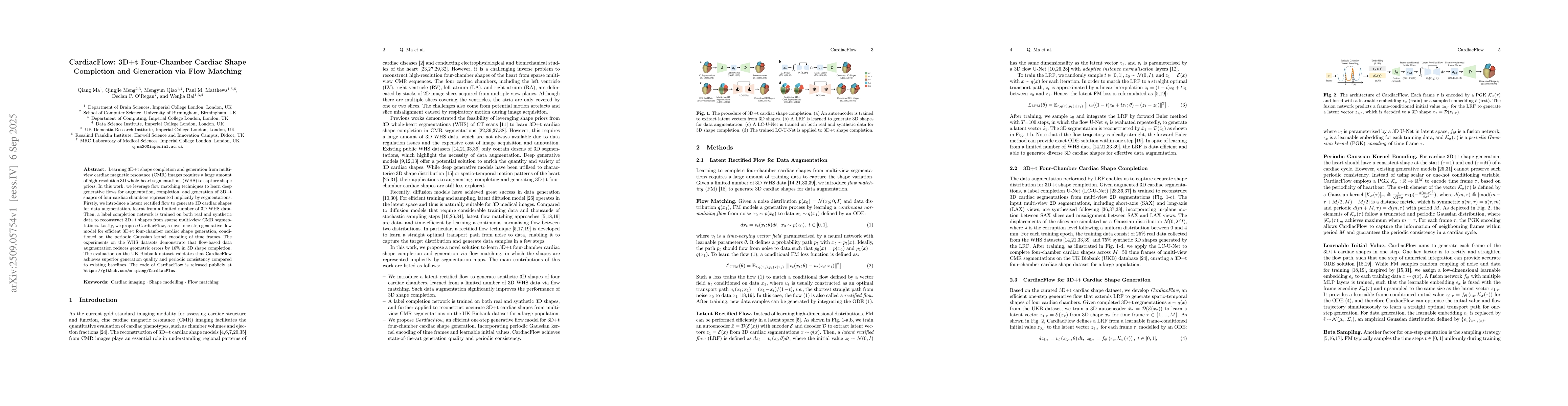 Learning 3D+t shape completion and generation from multi-view cardiac magnetic resonance (CMR) images requires a large amount of high-resolution 3D whole-heart segmentations (WHS) to capture shape priors. In this work, we leverage flow matching techniques to learn deep generative flows for augmentation, completion, and generation of 3D+t shapes of four cardiac chambers represented implicitly by segmentations. Firstly, we introduce a latent rectified flow to generate 3D cardiac shapes for data augmentation, learnt from a limited number of 3D WHS data. Then, a label completion network is trained on both real and synthetic data to reconstruct 3D+t shapes from sparse multi-view CMR segmentations. Lastly, we propose CardiacFlow, a novel one-step generative flow model for efficient 3D+t four-chamber cardiac shape generation, conditioned on the periodic Gaussian kernel encoding of time frames. The experiments on the WHS datasets demonstrate that flow-based data augmentation reduces geometric errors by 16% in 3D shape completion. The evaluation on the UK Biobank dataset validates that CardiacFlow achieves superior generation quality and periodic consistency compared to existing baselines.