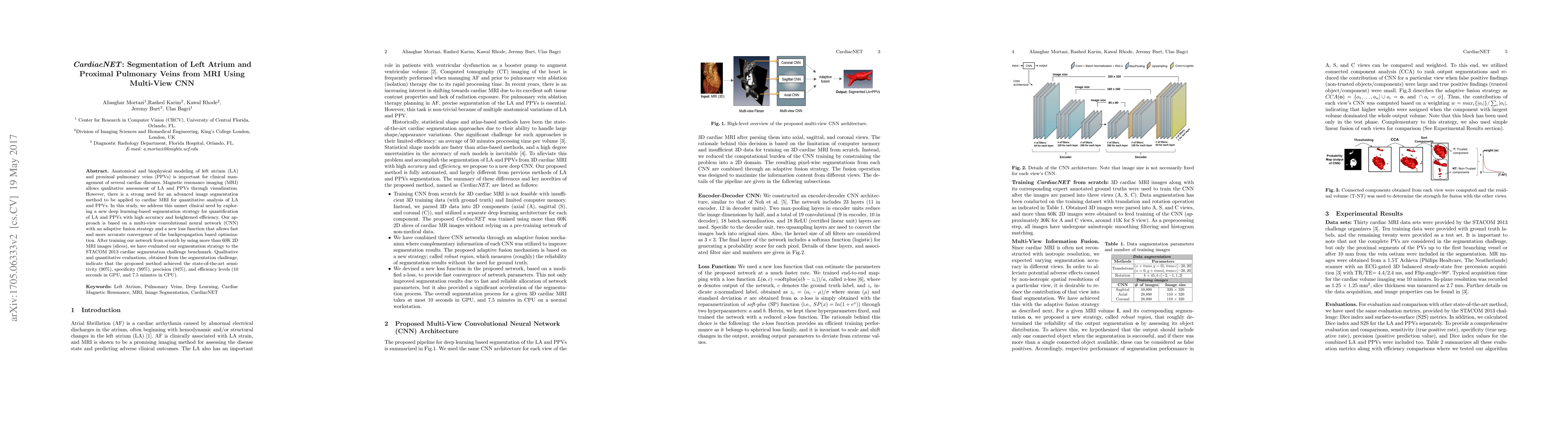 The paper presents CardiacNET, a multi-view CNN for precise segmentation of the left atrium and proximal pulmonary veins from MRI, achieving state-of-the-art sensitivity, specificity, and efficiency in the STACOM 2013 cardiac segmentation challenge. The method uses an adaptive fusion strategy and a novel loss function for optimal performance.