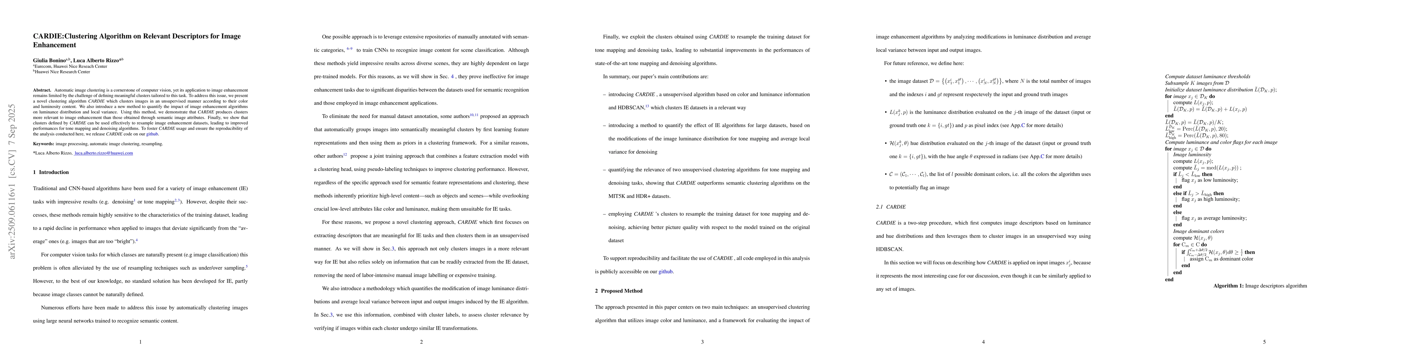 Automatic image clustering is a cornerstone of computer vision, yet its application to image enhancement remains limited, primarily due to the difficulty of defining clusters that are meaningful for this specific task. To address this issue, we introduce CARDIE, an unsupervised algorithm that clusters images based on their color and luminosity content. In addition, we introduce a method to quantify the impact of image enhancement algorithms on luminance distribution and local variance. Using this method, we demonstrate that CARDIE produces clusters more relevant to image enhancement than those derived from semantic image attributes. Furthermore, we demonstrate that CARDIE clusters can be leveraged to resample image enhancement datasets, leading to improved performance for tone mapping and denoising algorithms. To encourage adoption and ensure reproducibility, we publicly release CARDIE code on our GitHub.