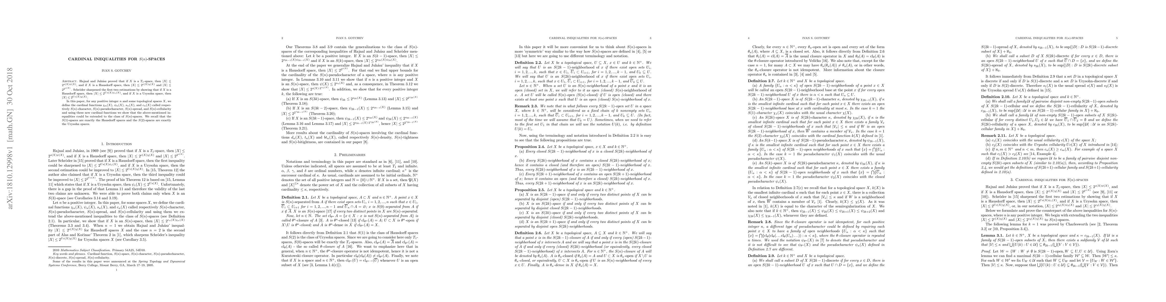 Hajnal and Juh\'asz proved that if $X$ is a $T_1$-space, then $|X|\le 2^{s(X)\psi(X)}$, and if $X$ is a Hausdorff space, then $|X|\le 2^{c(X)\chi(X)}$ and $|X|\le 2^{2^{s(X)}}$. Schr\"oder sharpened the first two estimations by showing that if $X$ is a Hausdorff space, then $|X|\le 2^{Us(X)\psi_c(X)}$, and if $X$ is a Urysohn space, then $|X|\le 2^{Uc(X)\chi(X)}$. In this paper, for any positive integer $n$ and some topological spaces $X$, we define the cardinal functions $\chi_n(X)$, $\psi_n(X)$, $s_n(X)$, and $c_n(X)$, called respectively $S(n)$-character, $S(n)$-pseudocharacter, $S(n)$-spread, and $S(n)$-cellularity, and using these new cardinal functions we show that the above-mentioned inequalities could be extended to the class of $S(n)$-spaces. We recall that the $S(1)$-spaces are exactly the Hausdorff spaces and the $S(2)$-spaces are exactly the Urysohn spaces.