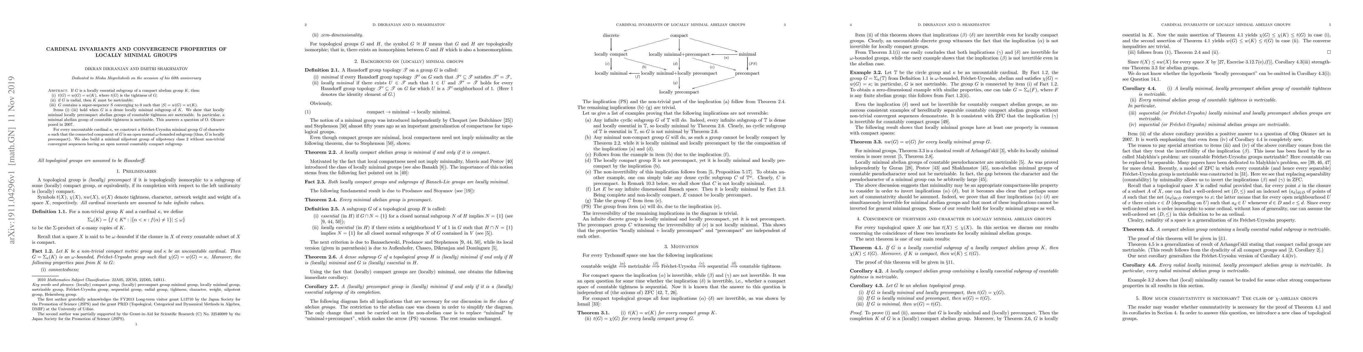 If G is a locally essential subgroup of a compact abelian group K, then: (i) t(G)=w(G)=w(K), where t(G) is the tightness of G; (ii) if G is radial, then K must be metrizable; (iii) G contains a super-sequence S converging to 0 such that |S|=w(G)=w(K). Items (i)--(iii) hold when G is a dense locally minimal subgroup of K. We show that locally minimal, locally precompact abelian groups of countable tightness are metrizable. In particular, a minimal abelian group of countable tightness is metrizable. This answers a question of O. Okunev posed in 2007. For every uncountable cardinal kappa, we construct a Frechet-Urysohn minimal group G of character kappa such that the connected component of G is an open normal omega-bounded subgroup (thus, G is locally precompact). We also build a minimal nilpotent group of nilpotency class 2 without non-trivial convergent sequences having an open normal countably compact subgroup.