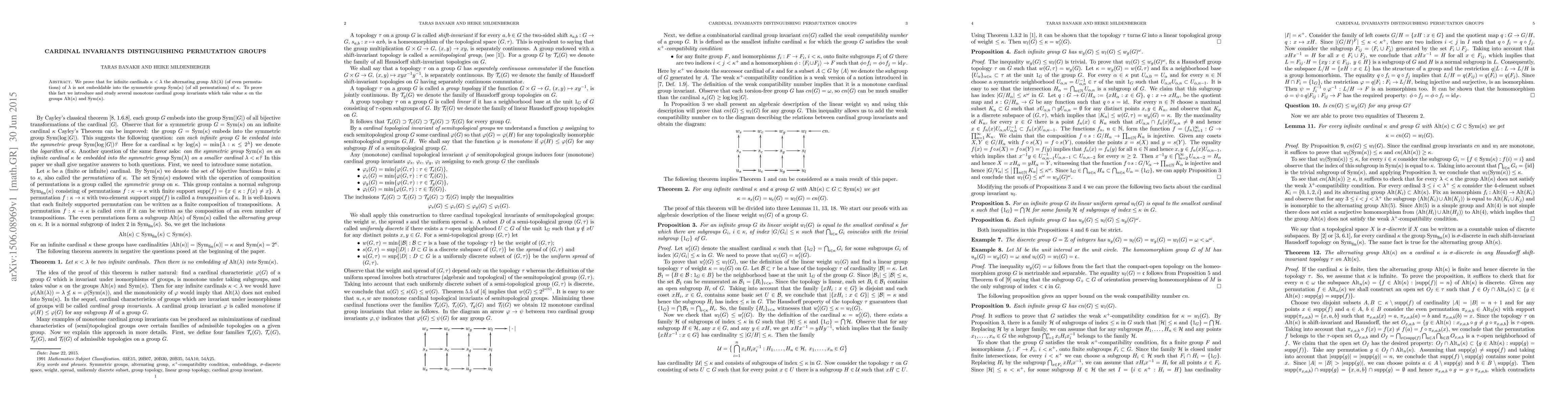 Researchers prove that the alternating group of even permutations cannot be embedded into the symmetric group for certain infinite cardinal values, creating new cardinal invariants to distinguish between these groups.