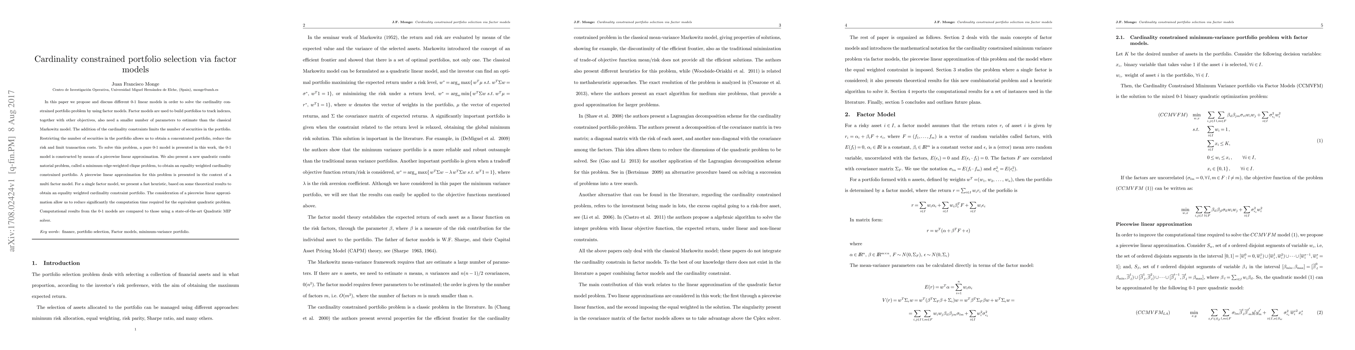 In this paper we propose and discuss different 0-1 linear models in order to solve the cardinality constrained portfolio problem by using factor models. Factor models are used to build portfolios to track indexes, together with other objectives, also need a smaller number of parameters to estimate than the classical Markowitz model. The addition of the cardinality constraints limits the number of securities in the portfolio. Restricting the number of securities in the portfolio allows us to obtain a concentrated portfolio, reduce the risk and limit transaction costs. To solve this problem, a pure 0-1 model is presented in this work, the 0-1 model is constructed by means of a piecewise linear approximation. We also present a new quadratic combinatorial problem, called a minimum edge-weighted clique problem, to obtain an equality weighted cardinality constrained portfolio. A piecewise linear approximation for this problem is presented in the context of a multi factor model. For a single factor model, we present a fast heuristic, based on some theoretical results to obtain an equality weighted cardinality constraint portfolio. The consideration of a piecewise linear approximation allow us to reduce significantly the computation time required for the equivalent quadratic problem. Computational results from the 0-1 models are compared to those using a state-of-the-art Quadratic MIP solver.