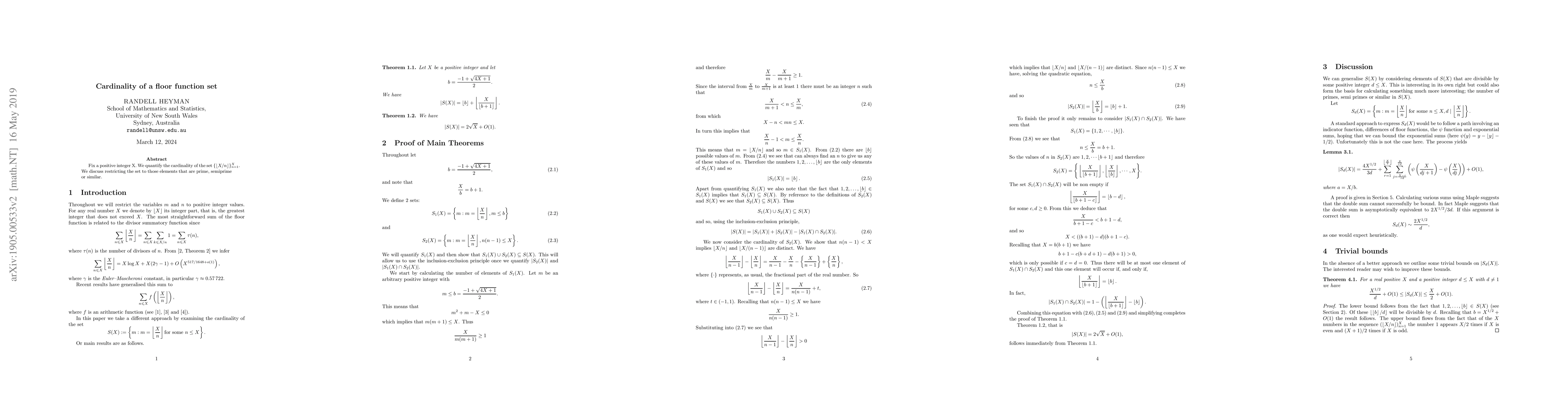 This paper investigates the cardinality of the set formed by the floor function $\{\lfloor X/n \rfloor\}_{n=1}^X$ for a given positive integer $X$, and explores subsets where elements are prime, semiprime, or similar. The study aims to quantify these restricted cardinalities.