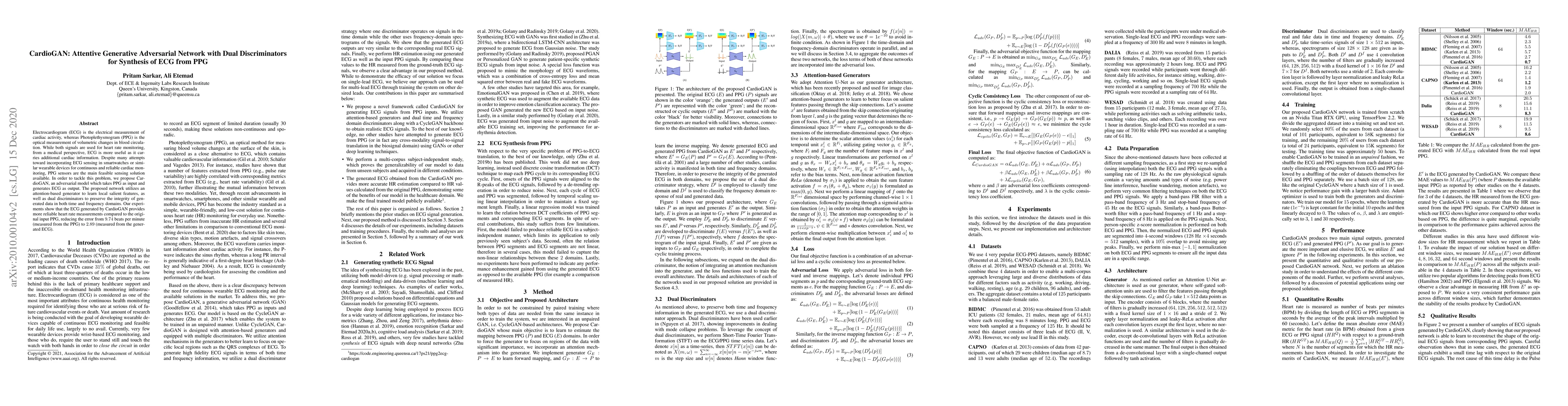 CardioGAN introduces an attention-based generator with dual discriminators to synthesize ECG from PPG signals, preserving data integrity in both time and frequency domains.
