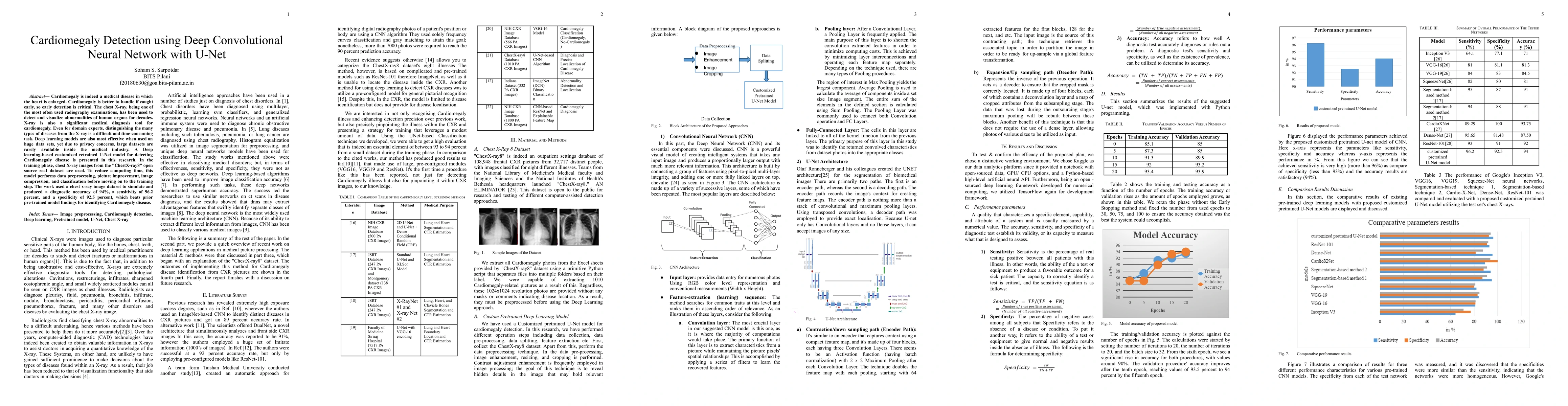 This research presents a deep learning-based U-Net model for detecting cardiomegaly from chest X-ray images, achieving a diagnostic accuracy of 94%, sensitivity of 96.2%, and specificity of 92.5%, outperforming previous models. The study utilizes the "ChestX-ray8" dataset and incorporates data preprocessing and image compression to enhance efficiency.