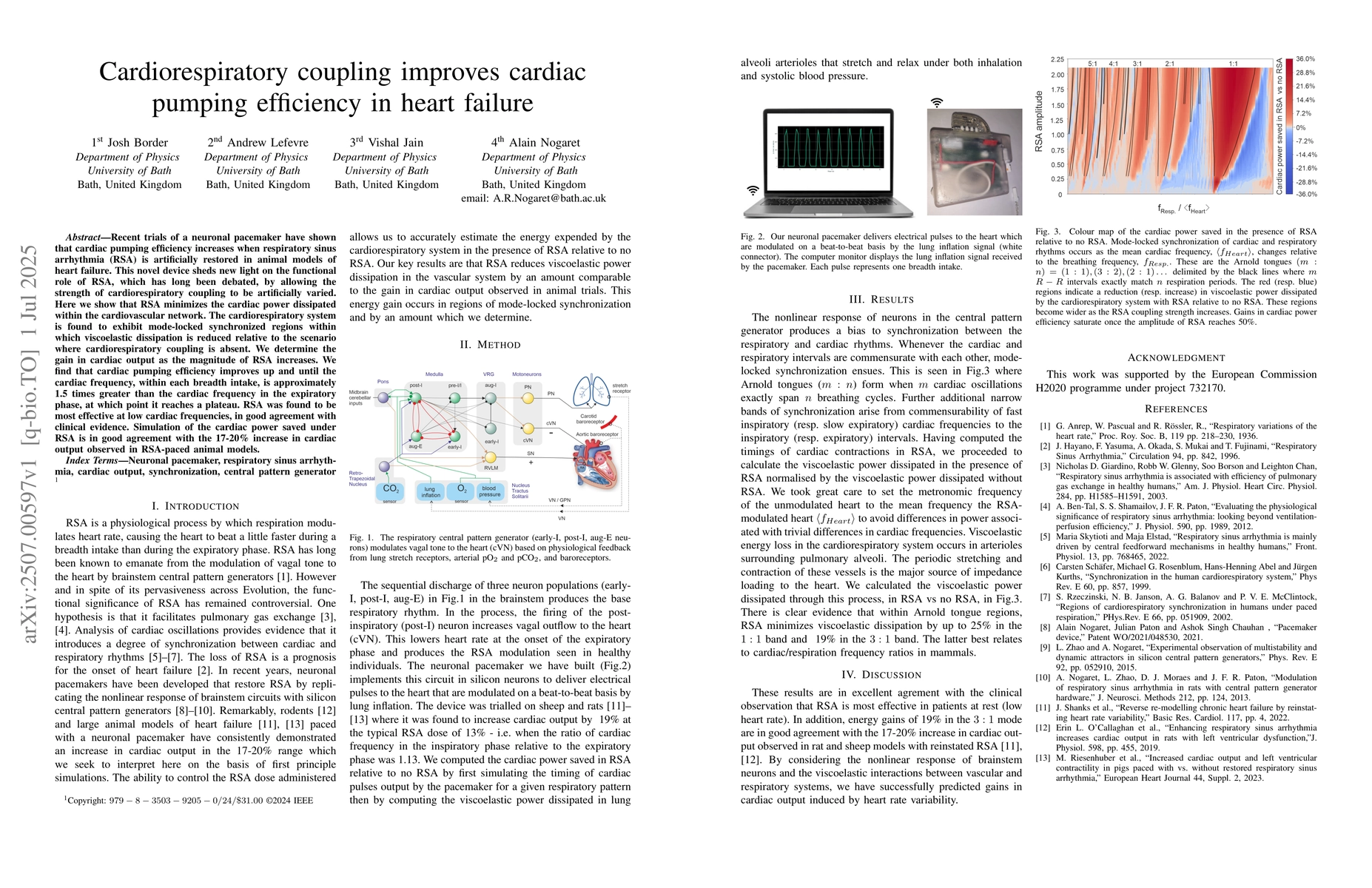 The research utilized a neuronal pacemaker to artificially restore respiratory sinus arrhythmia (RSA) in animal models of heart failure, allowing for the variation of cardiorespiratory coupling strength.
