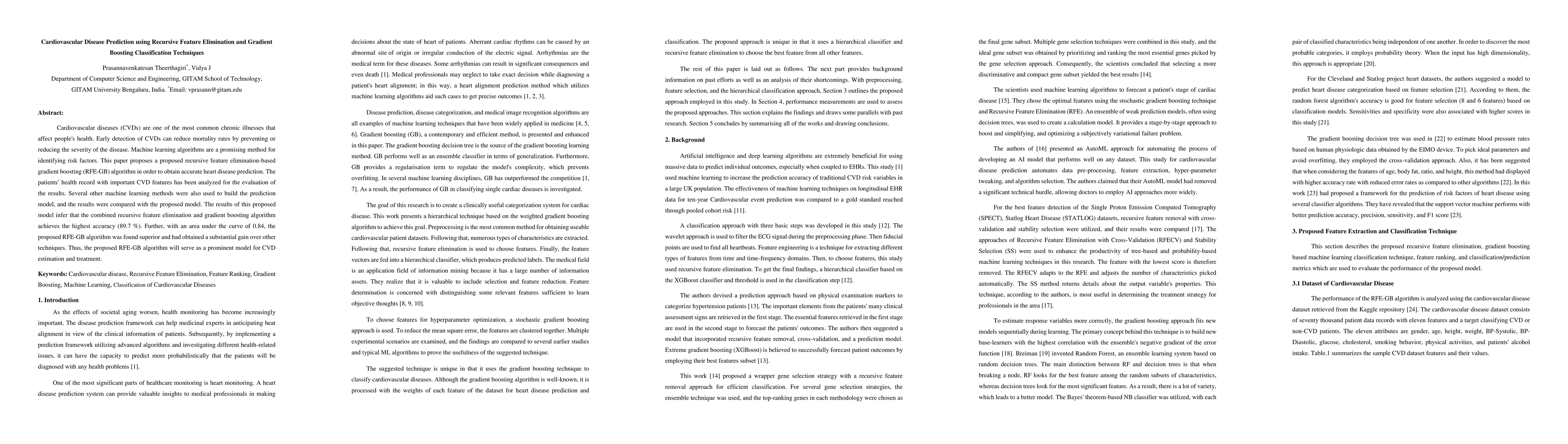 Cardiovascular diseases (CVDs) are one of the most common chronic illnesses that affect peoples health. Early detection of CVDs can reduce mortality rates by preventing or reducing the severity of the disease. Machine learning algorithms are a promising method for identifying risk factors. This paper proposes a proposed recursive feature elimination-based gradient boosting (RFE-GB) algorithm in order to obtain accurate heart disease prediction. The patients health record with important CVD features has been analyzed for the evaluation of the results. Several other machine learning methods were also used to build the prediction model, and the results were compared with the proposed model. The results of this proposed model infer that the combined recursive feature elimination and gradient boosting algorithm achieves the highest accuracy (89.7 %). Further, with an area under the curve of 0.84, the proposed RFE-GB algorithm was found superior and had obtained a substantial gain over other techniques. Thus, the proposed RFE-GB algorithm will serve as a prominent model for CVD estimation and treatment.