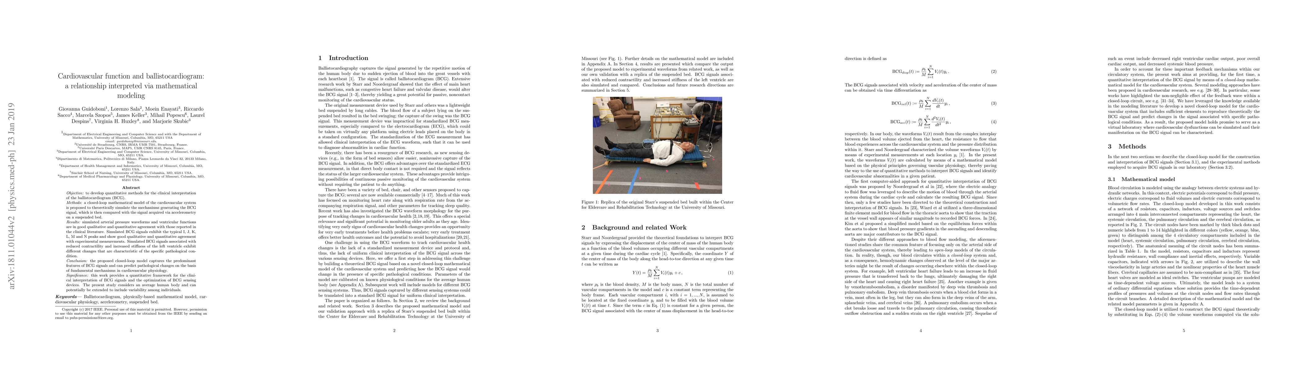 A mathematical model simulates cardiovascular function to interpret ballistocardiogram signals, predicting pathological changes in the heart. The model offers a quantitative framework for clinical interpretation of BCG signals.